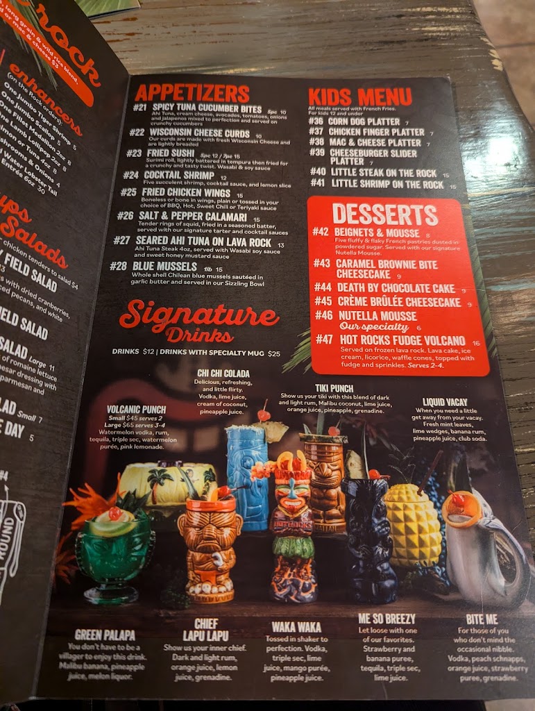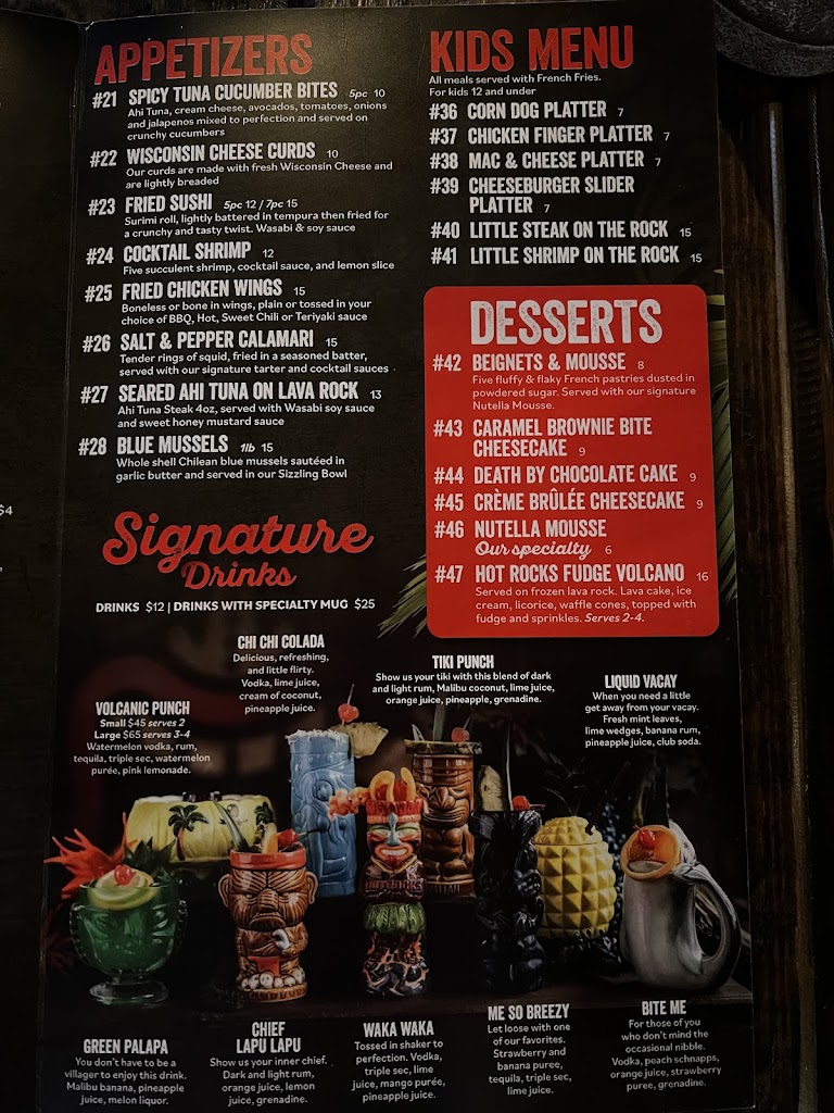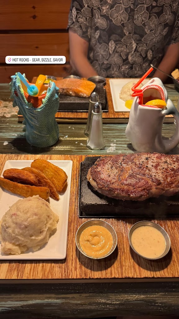 Hot Rocks is a one-of-a-kind dining experience where you become the chef! Located in Wisconsin Dells, our lava rock restaurant brings the sizzle straight to your table. Cook your choice of premium meats or fresh seafood on a 750-degree volcanic rock for a meal that's hot, fresh, and full of flavor. Whether you're here for a fun night out, a unique date, or a family dinner, Hot Rocks offers an interactive, tropical-inspired atmosphere that turns every meal into an adventure. Pair your sizzling entrée with one of our signature cocktails, like the Volcano Punch Bowl, and enjoy an unforgettable dining experience.