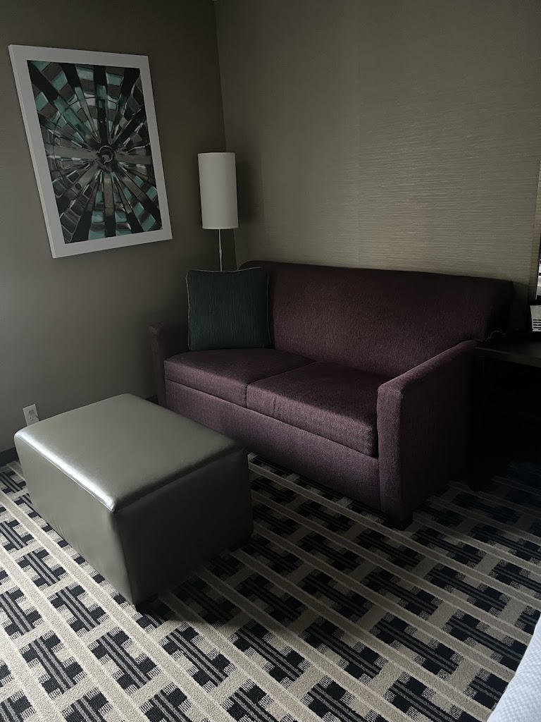 The staff was very friendly and helpful. The room was clean and roomy for traveling solo. The gym was nice and I didn't get a chance to use it but the sauna and pool looked nice. The breakfast was good too. Nice selection. Would definitely stay here again. Only complaint would be not being able to get the room colder.