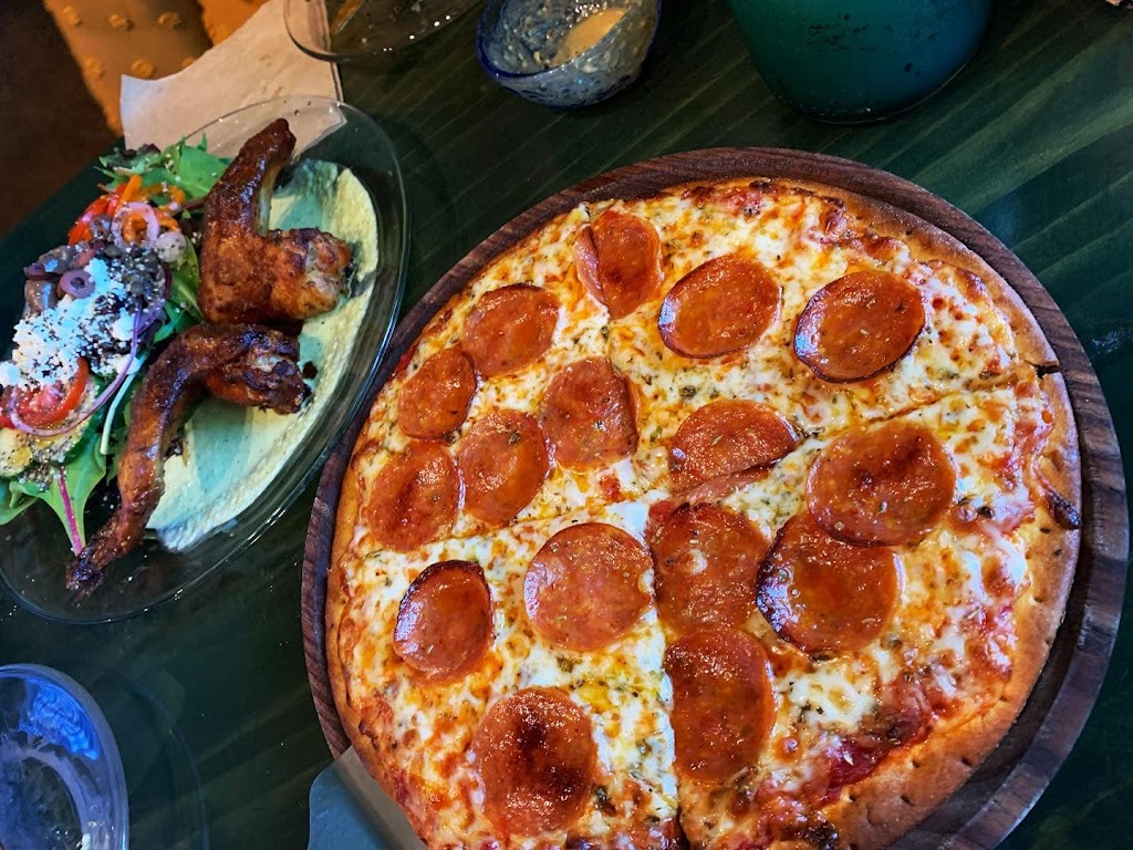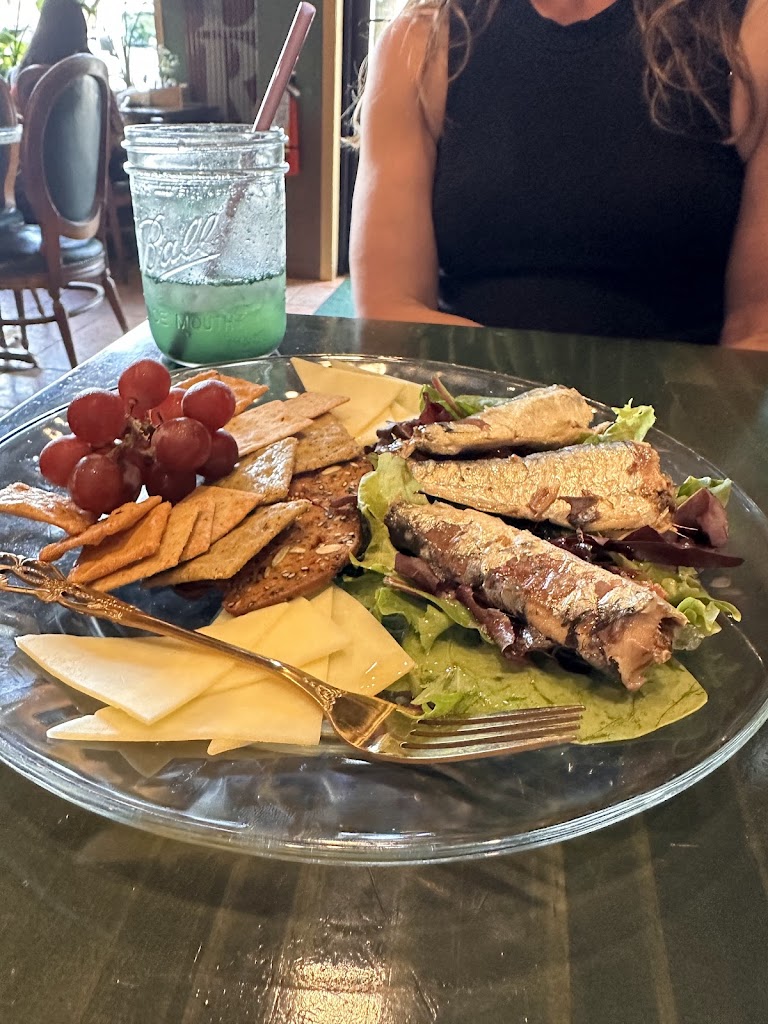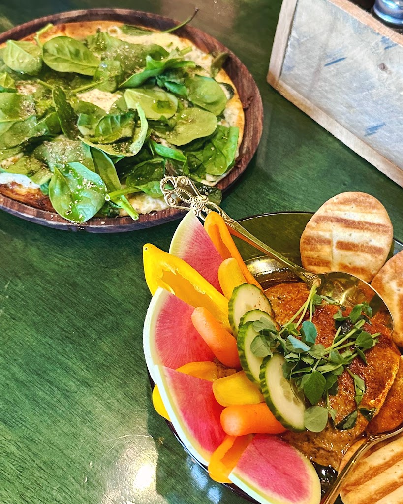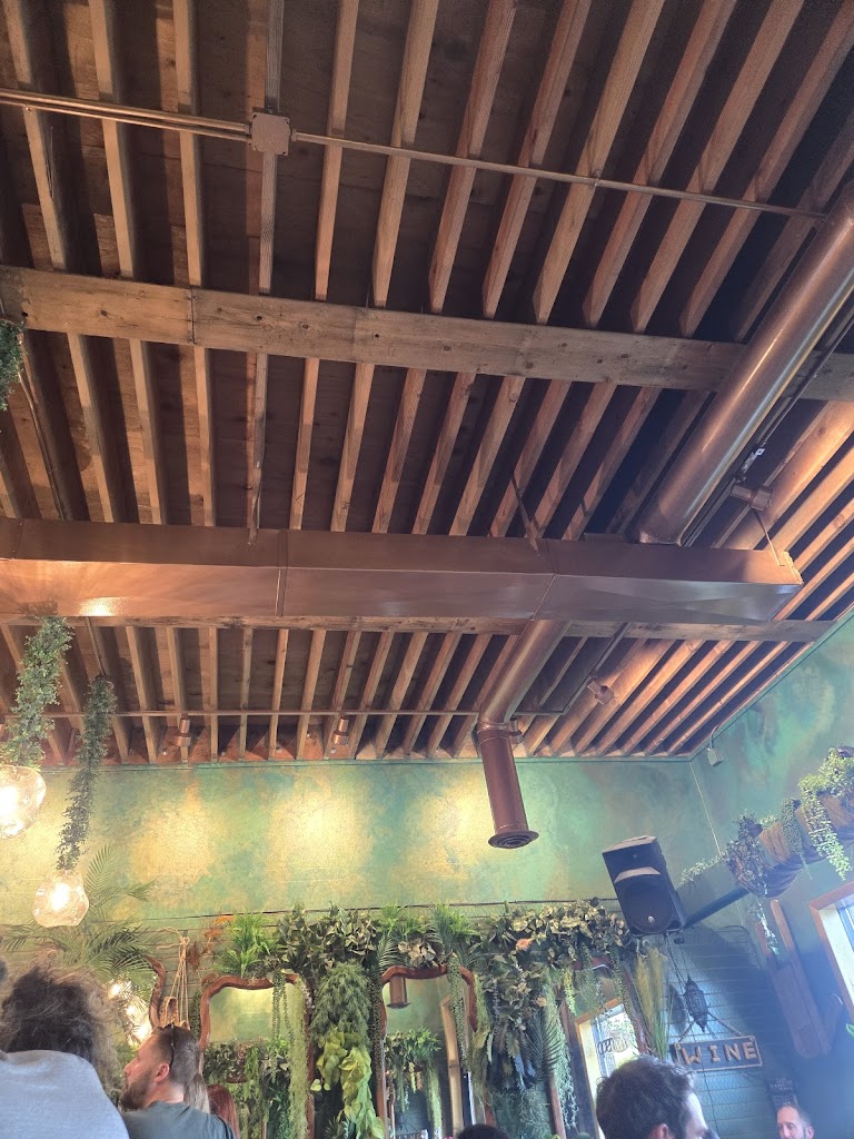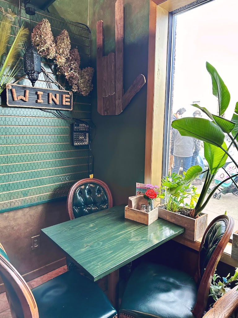This is an eco-friendly restaurant with many vegan and vegetarian options. It has a cozy all green decor that would make you want to pop in if you peeked inside while walking by. While I wasn't into the sardine app, I liked my Lions mane lobster roll and the Peruvian chicken wings were really good. My kid liked the cheese pizza and then we put the green sauce on the extra pizza she couldn't finish. There is a charge for a takeout container so bring your own! This restaurant is small so a group of 6 or more would have a hard time getting a table.