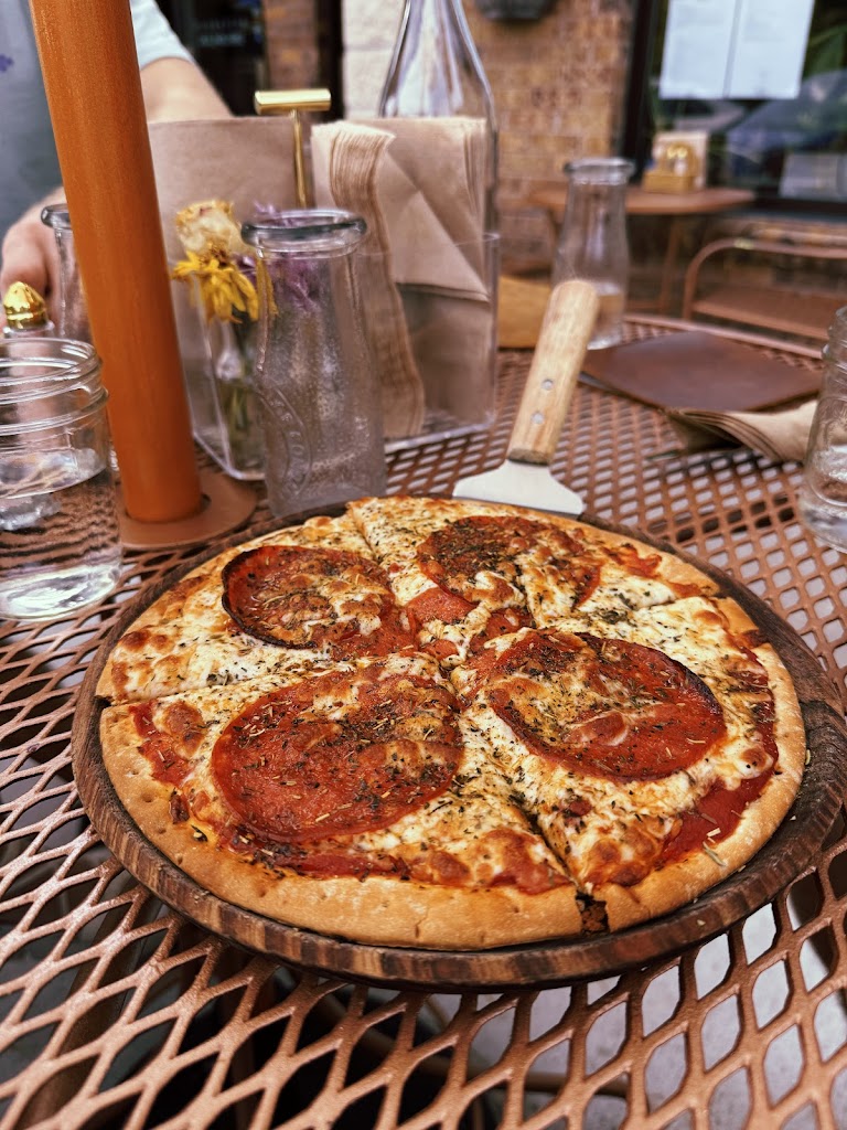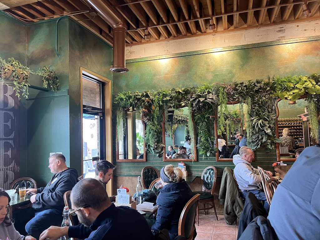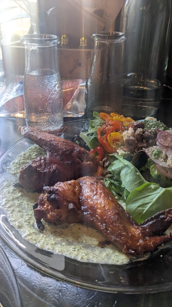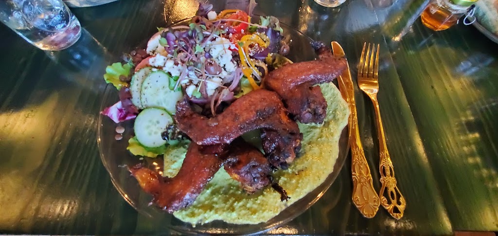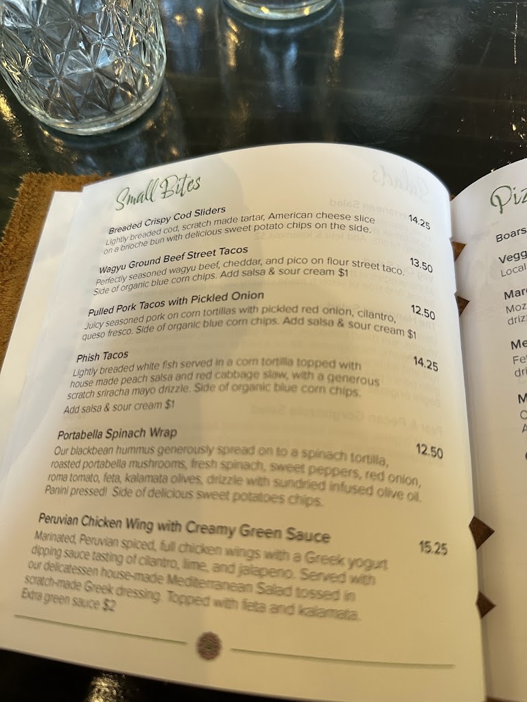 This is an eco-friendly restaurant with many vegan and vegetarian options. It has a cozy all green decor that would make you want to pop in if you peeked inside while walking by. While I wasn't into the sardine app, I liked my Lions mane lobster roll and the Peruvian chicken wings were really good. My kid liked the cheese pizza and then we put the green sauce on the extra pizza she couldn't finish. There is a charge for a takeout container so bring your own! This restaurant is small so a group of 6 or more would have a hard time getting a table.