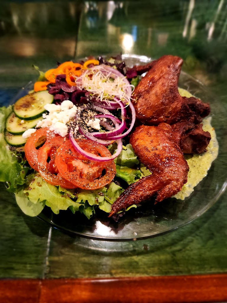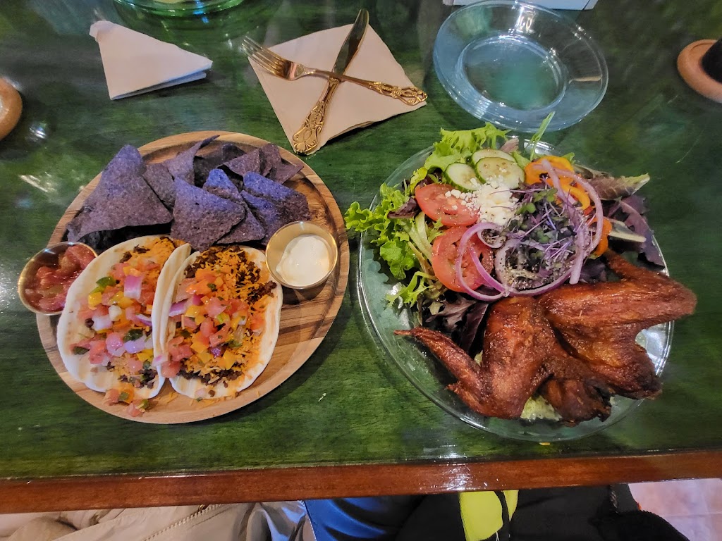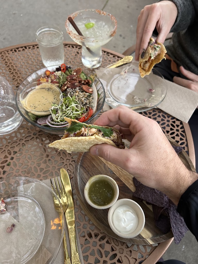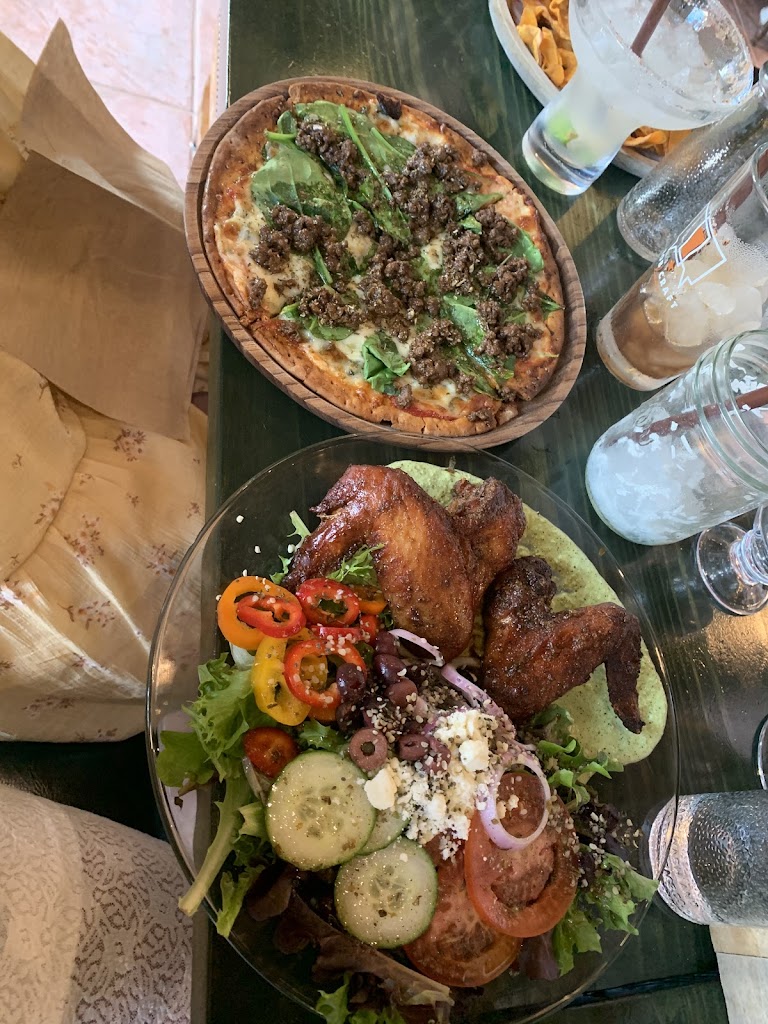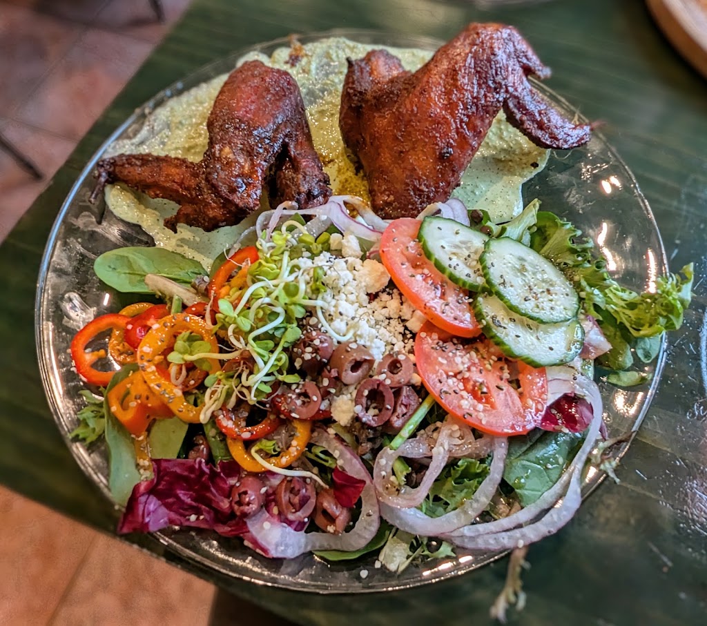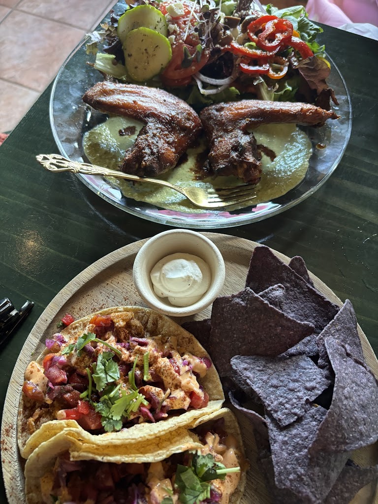 My fiance likes pretty plain food but I’m all about flavor and dips/sauces. I showed him their menu (after searching restaurants the past two days and always returning to The House of Bogini’s menu) and he said he’d figure out something to try. I ended up getting the Peruvian chicken wings and Mediterranean salad, he got the wagyu street tacos. The portions were perfect for a meal and we felt full but still comfortable enough to go grab dessert down the street after. I had zero complaints with my meal- my fiance did wish the salsa that came with his tasted more homemade.