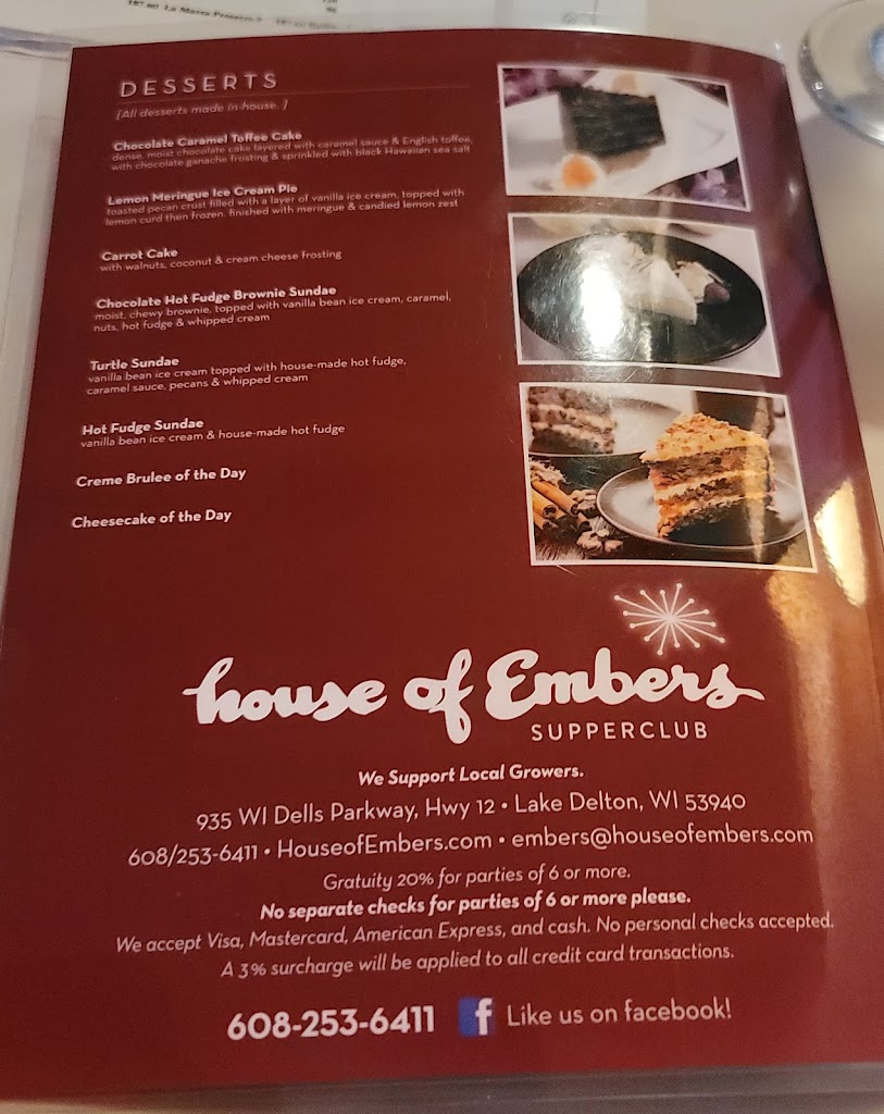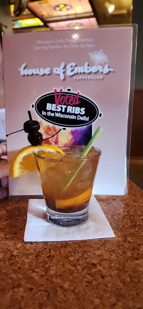 House of Embers is a traditional Wisconsin Supper club. Enjoy the Dells most unique fine dining experience in our main dining room or in our private romantic area. Enjoy summertime outdoor dining on our patio featuring live music on weekends. Daily happy hour & early bird specials. Hand cut USDA steaks, fresh fish, pastas, burgers, sandwiches & salads. The best homemade desserts you