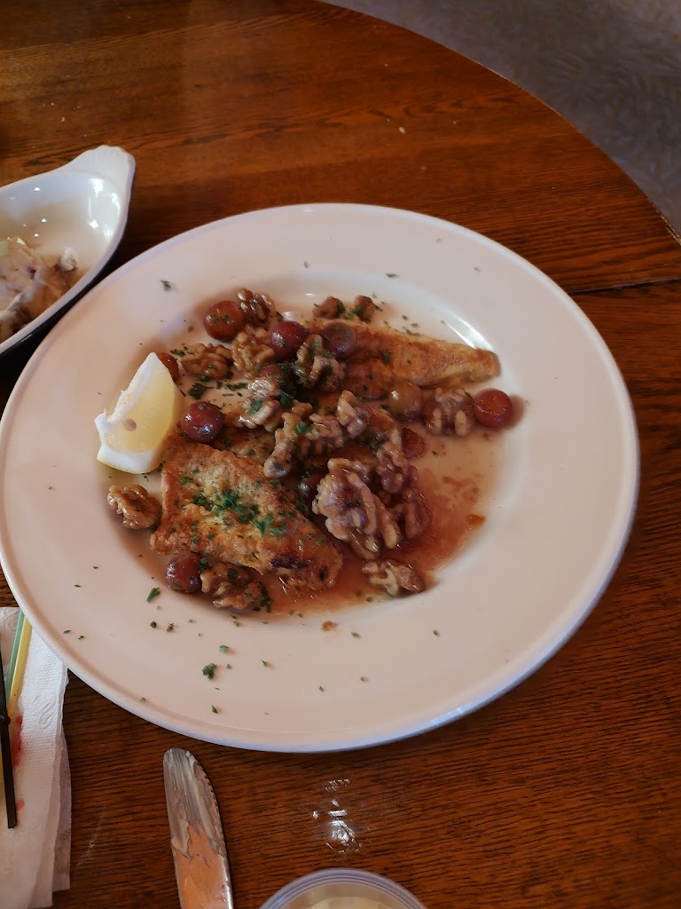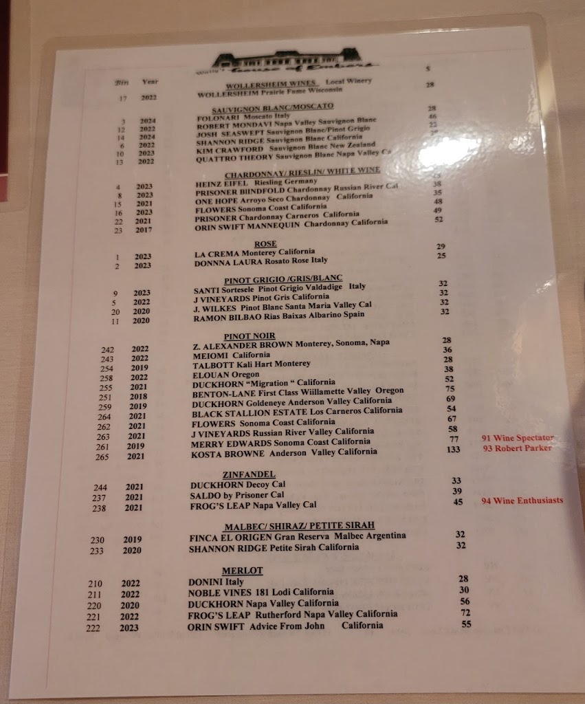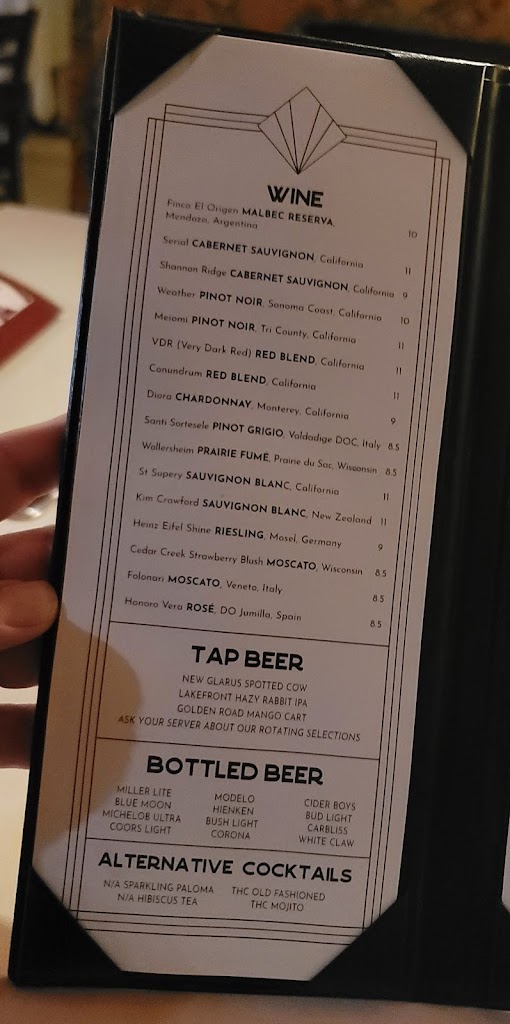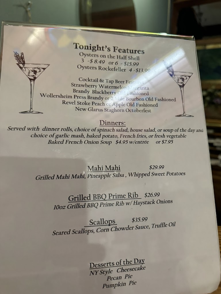 The food was delicious, the meal was well paced. The service was old school service, personable, knowledgeable, and on point. The menu had great options. The drink recommendation’s were good. The atmosphere felt quiet and intimate, and the restaurant had a joyful vibe. The restaurant itself is a bit dated but it did feel like a traditional Wisconsin restaurant. The restrooms were clean. The restaurant has an outdoor patio with live music during certain times and a Happy hour at the bar was available at certain times too.