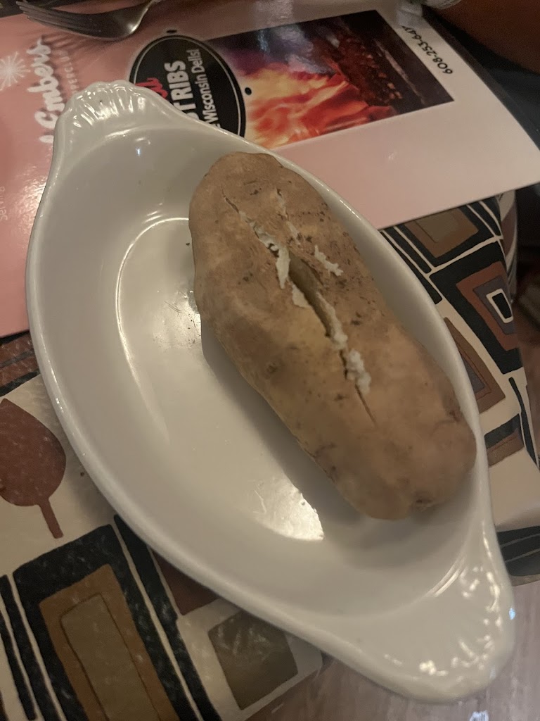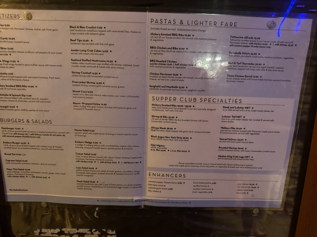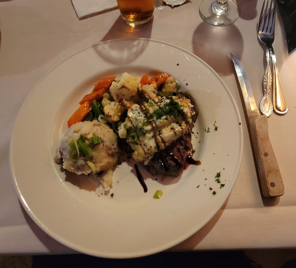 Magnificent supper club right on the strip of Lake Delton. This establishment has been here for years and I finally took the time to fine here. It was so well worth the visit. Immediately upon entering, the host and hostess, whom I presume are the owners, all smiley and such, welcomed me (as well as thanked me for my patronage with I left). The atmosphere was cozy with families dining together, enjoying a birthday together, etc. My server was a sweet lady who often checked on me. The food though, was off the chain! I made it during happy hour and didn't want to over eat as I still had a littke drive back to Milwaukee. I had the 8 oz. Sirloin topped with blue cheese. Using "Embers" as part of the name of their restaurant surely spoke for itself in the steak as it had a succulent char-grilled taste, perfectly medium-rare. The vegetable medley of cauliflower, green beans and carrots were perfectly al dente and buttery. The scoop of roasted mashed 🥔 with chives was delicious. Topped with two wheat and caraway seed dinner rolls prior and a Capital Brew Oktoberfest, I was satiated and not overly full. I ordered a piece of carrot cake to go and my server said it was enough for 4 people. She wasn't kidding. My wife and I shared it later and it was the best 🥕 cake we ever had. I will be returning to try the ribs and prime rib. This place is a treat.