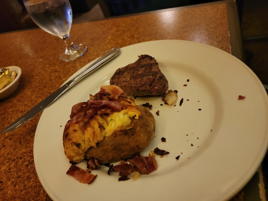 I ordered the ribeye Oscar MR ($55) and my wife ordered the petite filet MED & 5oz lobster tail ($59). Salads were ok, entrees arrived in good time. Wife's steak was cooked MR and was bland. My steak was very undercooked and had to be sent back. Sides were small, crab meat was shredded not lump and asparagus was woody. When my plate returned the second baked potato was smaller than the first, and the steak was medium on one end and still rare on the other. The cut of meat itself was horrible, far too high fat content and gristle throughout. I could have gotten a better cut of meat at an Applebee's.