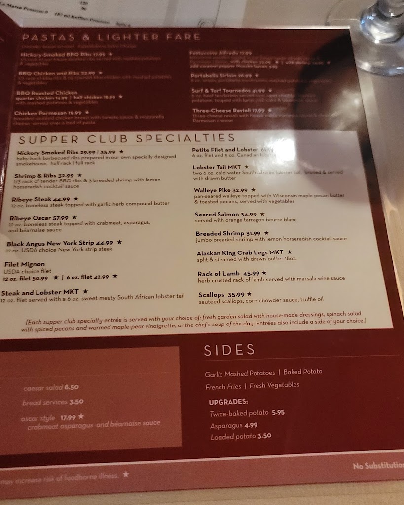 I found this super club superb. Especially in an area where everything is gimmicky. We got, oysters on the half shell, crab cakes, oysters Rockefeller, beef tips, portabella sirloin, prime rib & lobster, kids ravioli, and a ribeye. The apps were great. Wouldn't recommend the beef tips, just because the others were so great. I just returned from Maine prior to this, I thought the lobster was cool much better here. Prime rib was amazing, but my wife's portabella sirloin was my favorite. Mushrooms were great and thick, the temperature on the steak was perfect, and the sear was GREAT. Highly recommend. It is pricey, but you get what you pay for.