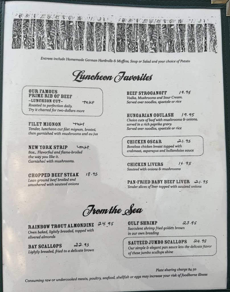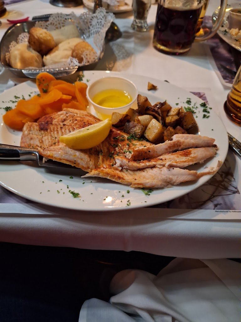 Busy night, and I decided to try something considered traditional. The meal wasn't BAD, but it was average. A smoked pork chop with no seasoning. A sausage and some sauerkraut, which was ok and some kind of rolled up beef with onions and peppers and a gravy. My wife's fried walleye fish was ok also. My salad with bleu cheese was phenomenal! The starters that are included were good as well. The drinks were good. We've decided to come back and try the prime rib on our next visit. Our waitress was good, but the waitress at nearby tables was a bit over the top for me to be honest. Loud and a bit much. Again, our waitress was good. One so-so visit doesn't tell the story, so we'll be back.
