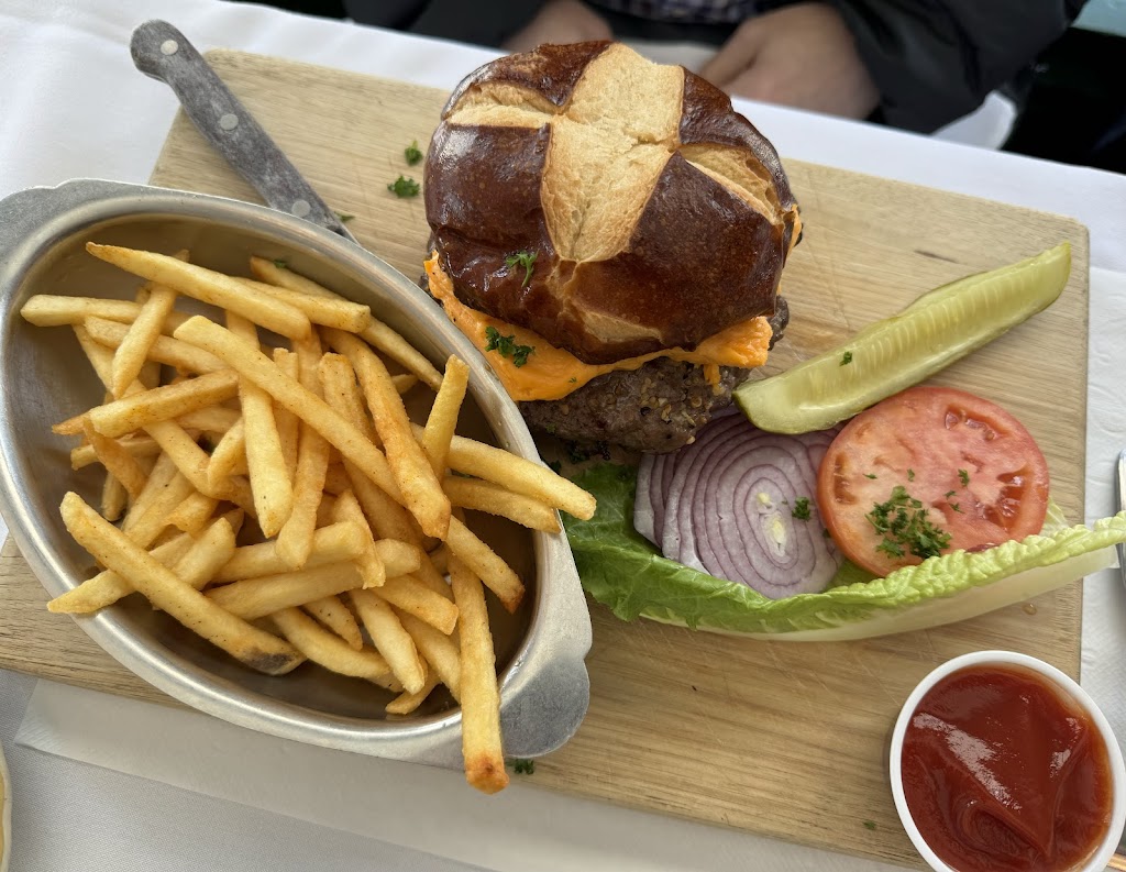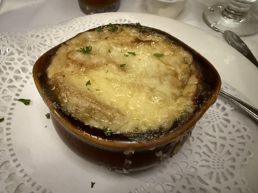 Baked French onion soup was outstanding! Salmon was prepared as requested. Sides were pickled red beets (like my mom used to make) and spaetzel. Homemade rolls and paté, and muffins. We enjoyed our personalized service. Our server was fun and helpful. This will be our "go to place" for future celebrations! Fun German atmosphere!