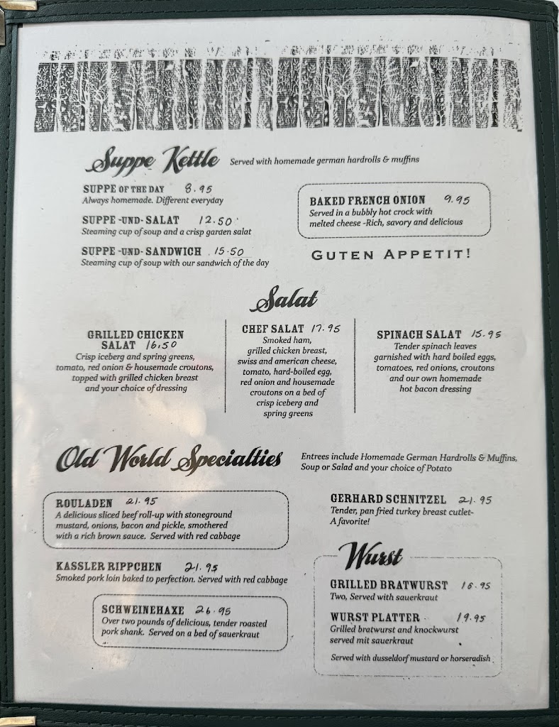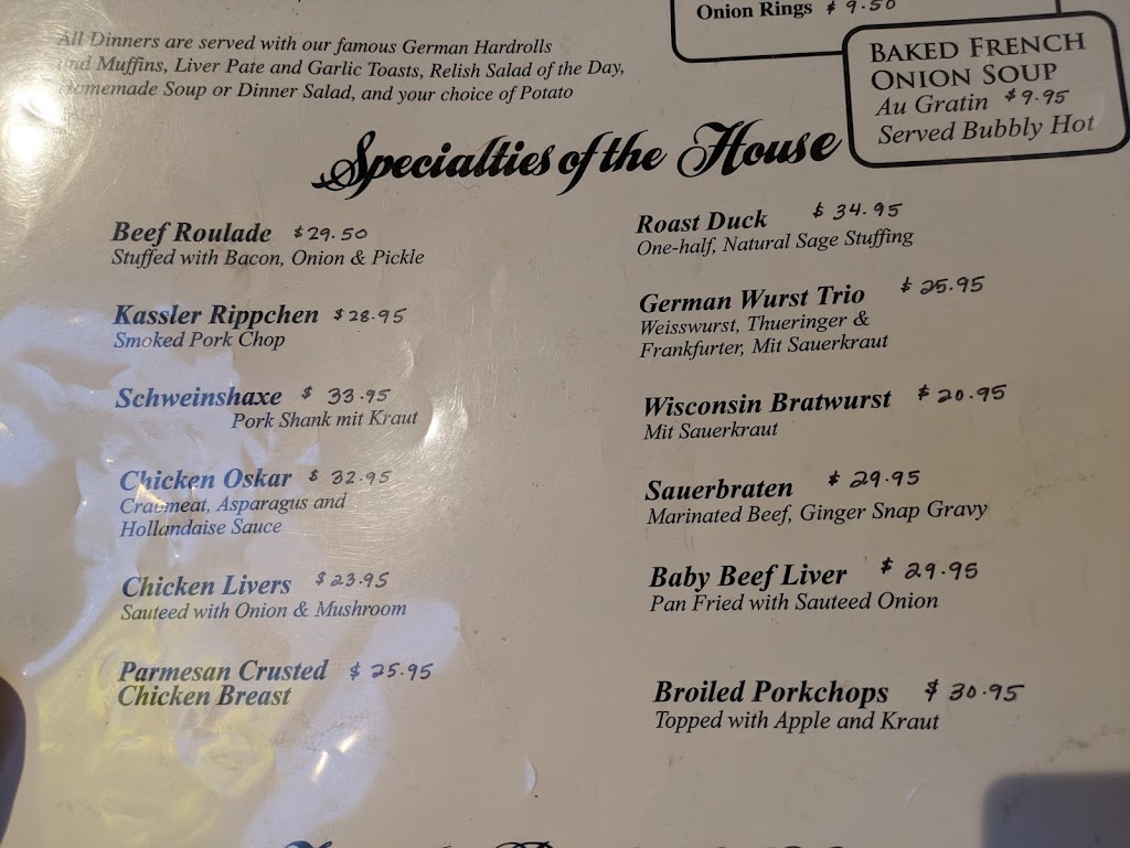 From Kenosha, and having led American military tourists through England, France, and Germany while living in Sicily, I found the German fare to be very disappointing. My relatives all recommended the Prime Rib, which is not German fare. My invited dinner guests had steaks and they had no complaints. I had Schnitzel and I was shocked to learn all their Schnitzel was TURKEY. In German, Schnitzel means "pig," I double checked this with friends in Berlin. At $30+ for breaded turkey, I expected something exceptional and boy was I disappointed.