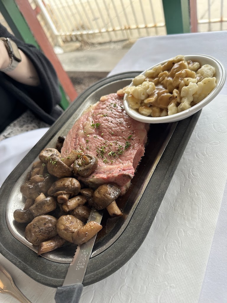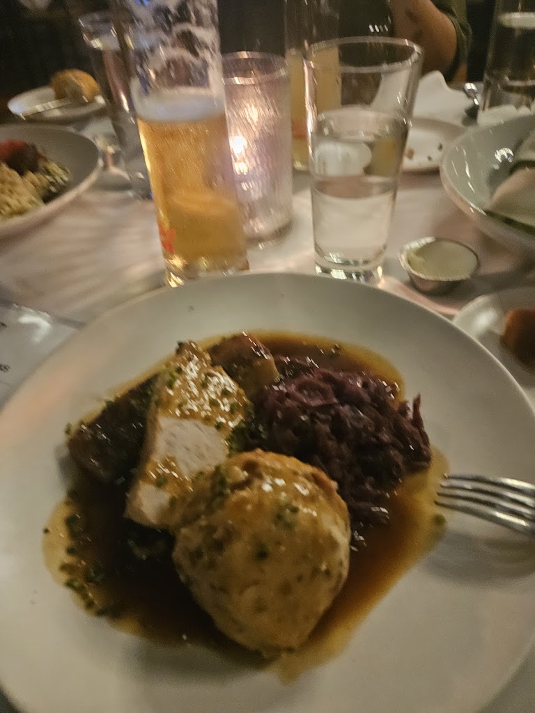 Overall great dinner experience with friends. Between the four we got the sausage sampler for appitizer. For mains we got the german platter ( sampler of the beef roulade, smoked pork chop, and one of the sausages), beef stroggenoff, roasted duck, and saurbraten with everyone trying a bit of everything.