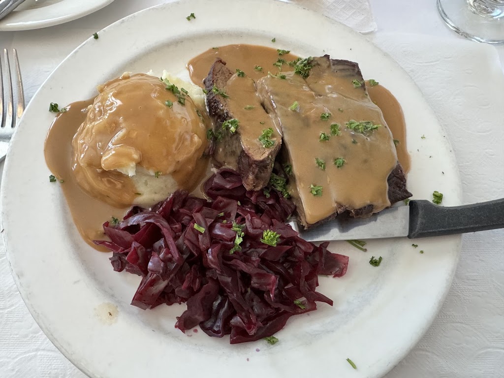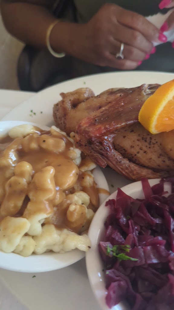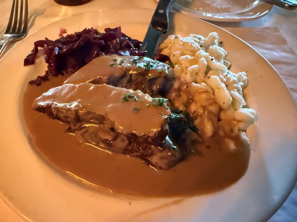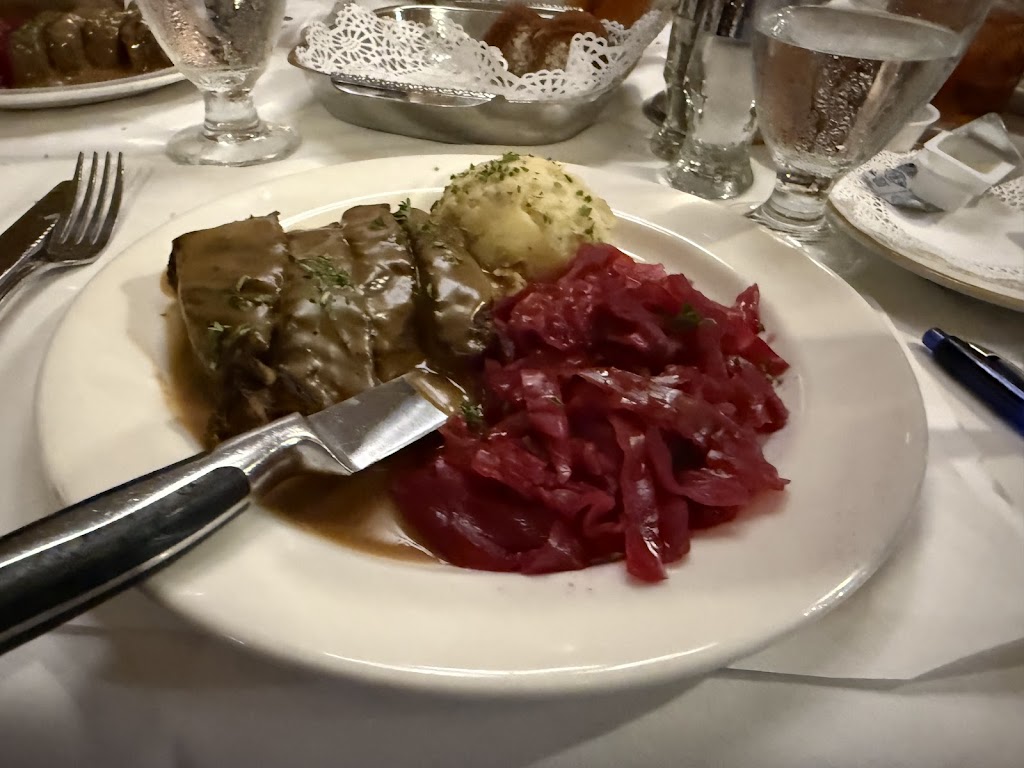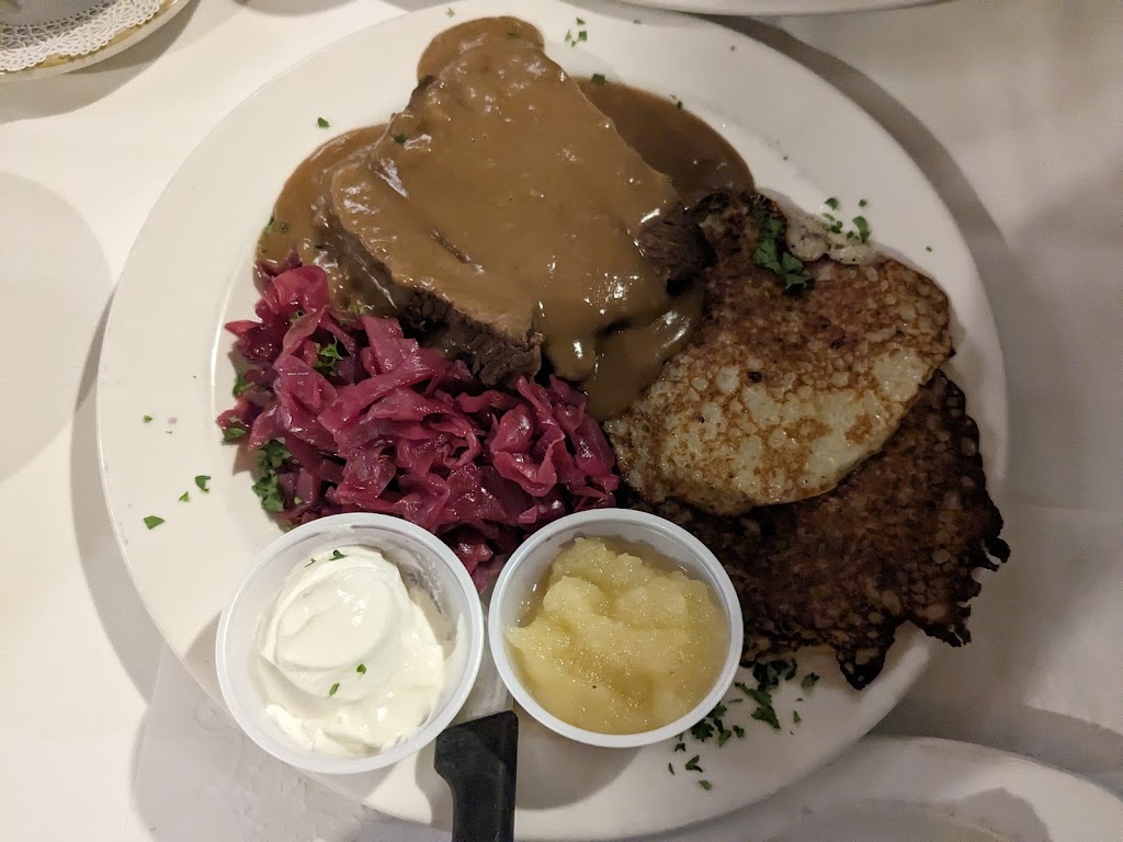 All the food was delicious with generous portion to price ratio. The Saurbraten was the table favorite followed by a close tie between the stroggenoff and duck and the german platter bringing up the rear only due to something having to come up last.