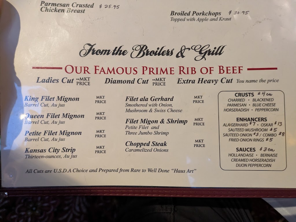 We had a 6:30 reservation and didn't get seated until almost 7:30. The prices are not cheap at all. Kansas City strip steak (market price) was $59.95 for a 13 ounce.