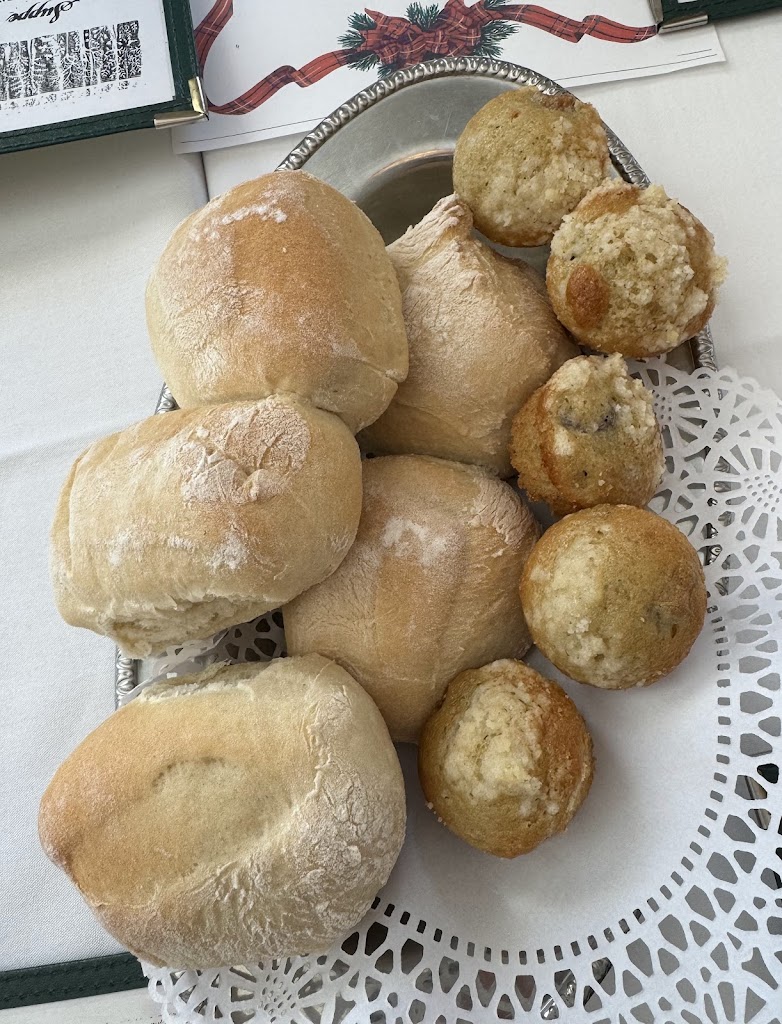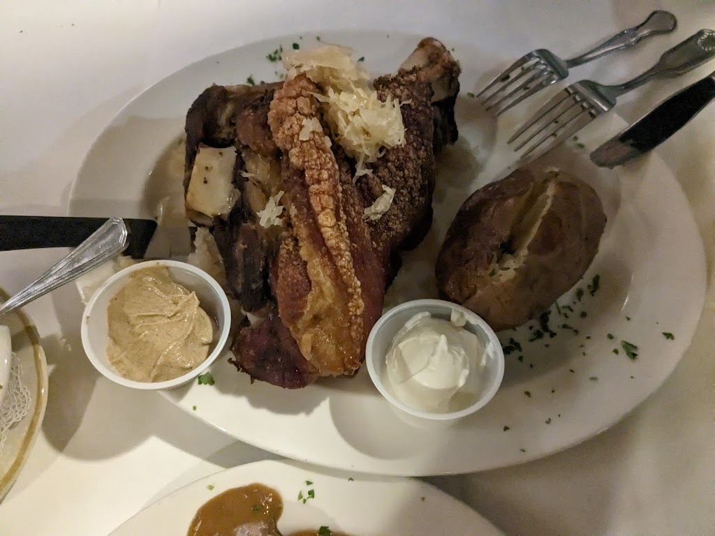 Five of us had dinner, appetizers, and drinks. Everyone was very happy with everything. Prime rib, schweinshaxe, crusted chicken, sausage assortment... All was outstanding! Appetizers were also good. Came with rolls, coleslaw, and chocolate chip mini muffins.