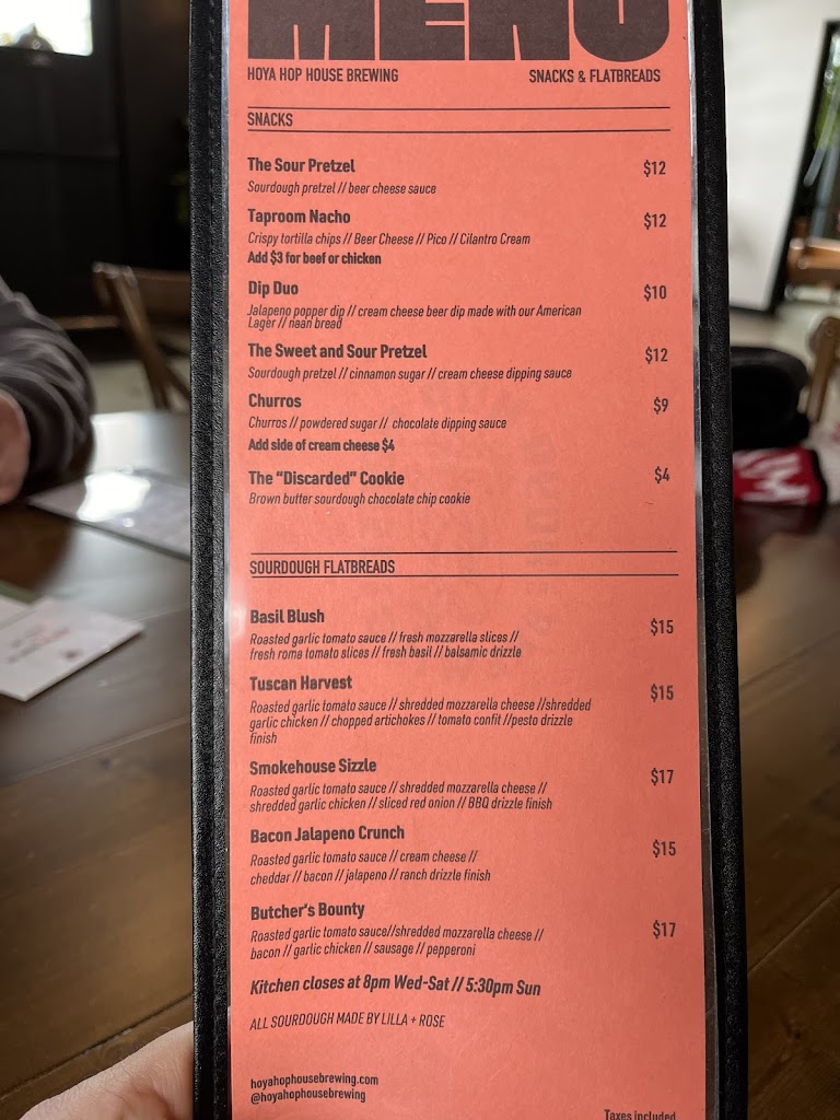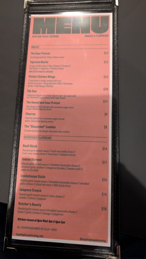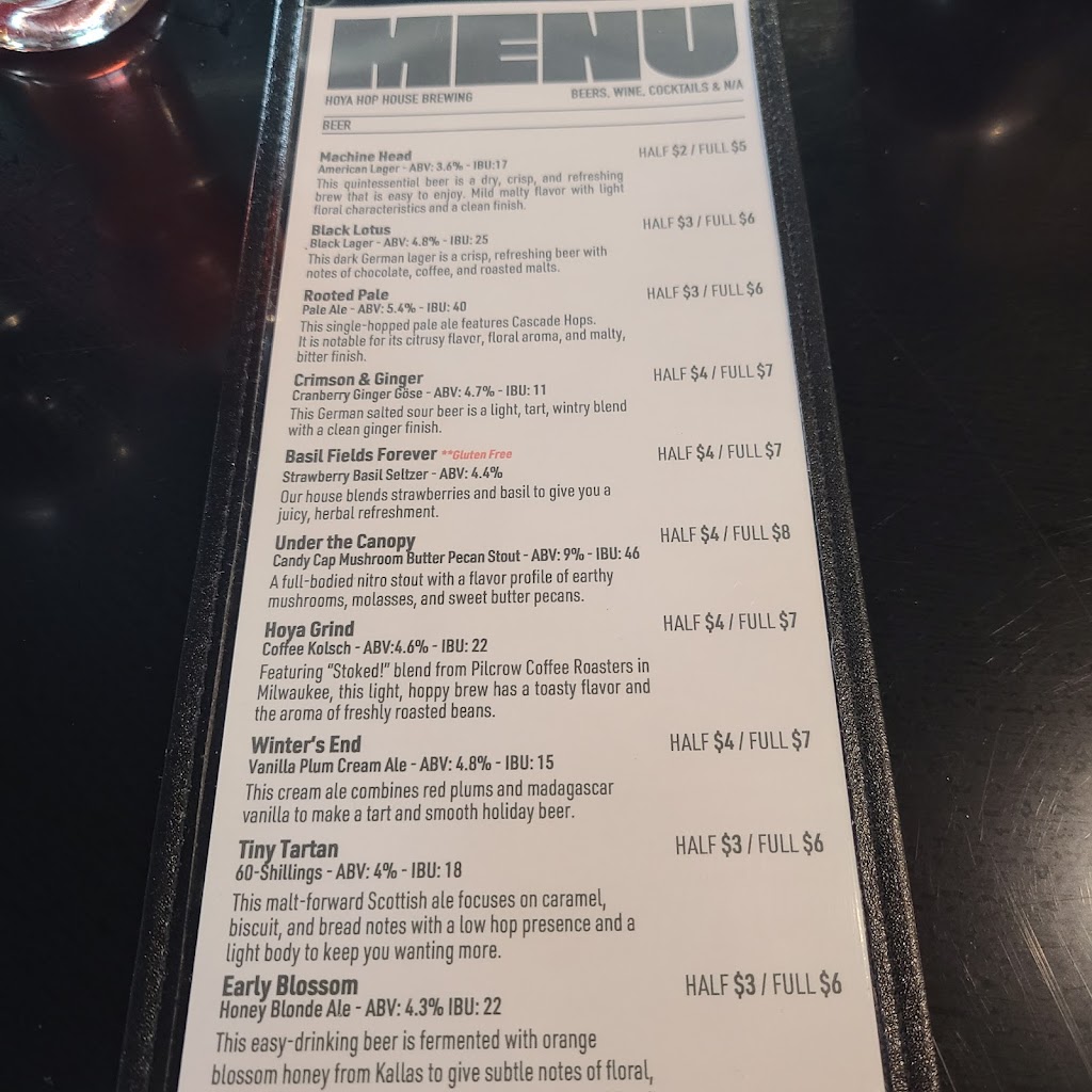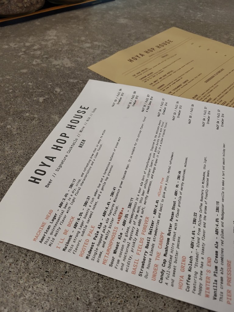 The wife and I love going to breweries and trying beers. Hoya hop looks awesome, but the beer was terrible. We tried several and they all tasted off, like they didn't sterilize the equipment properly before brewing them. The best thing was the microwaved sourdough pretzel, and even that wasn't worth the trip or cost.