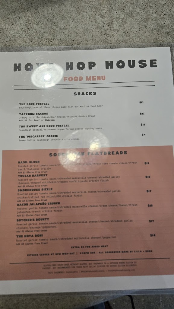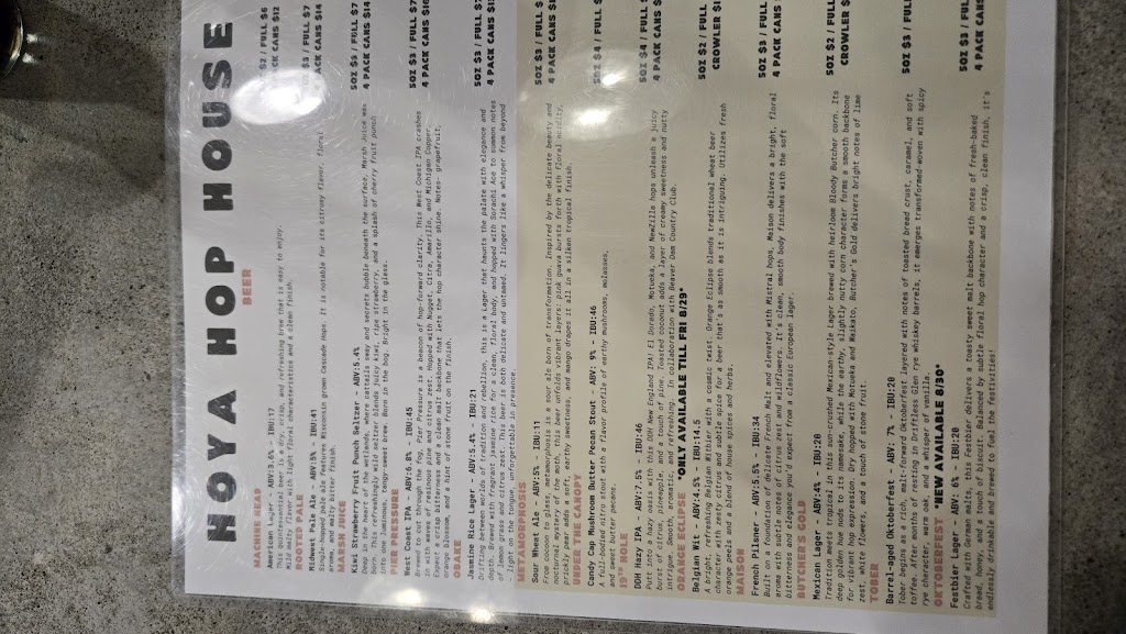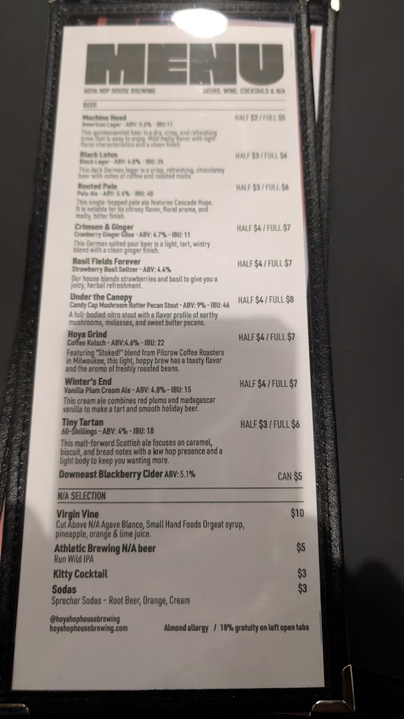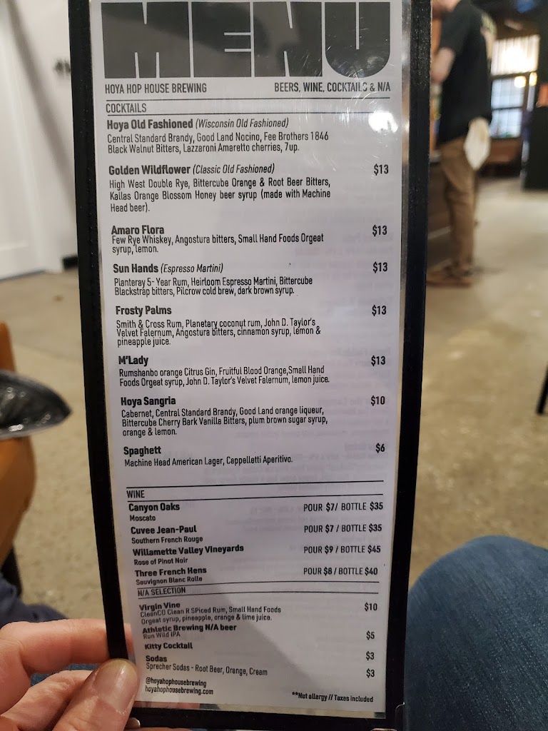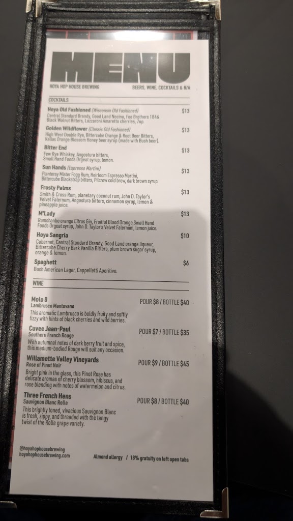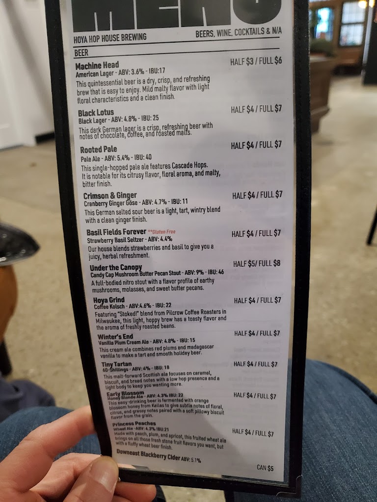 The wife and I love going to breweries and trying beers. Hoya hop looks awesome, but the beer was terrible. We tried several and they all tasted off, like they didn't sterilize the equipment properly before brewing them. The best thing was the microwaved sourdough pretzel, and even that wasn't worth the trip or cost.