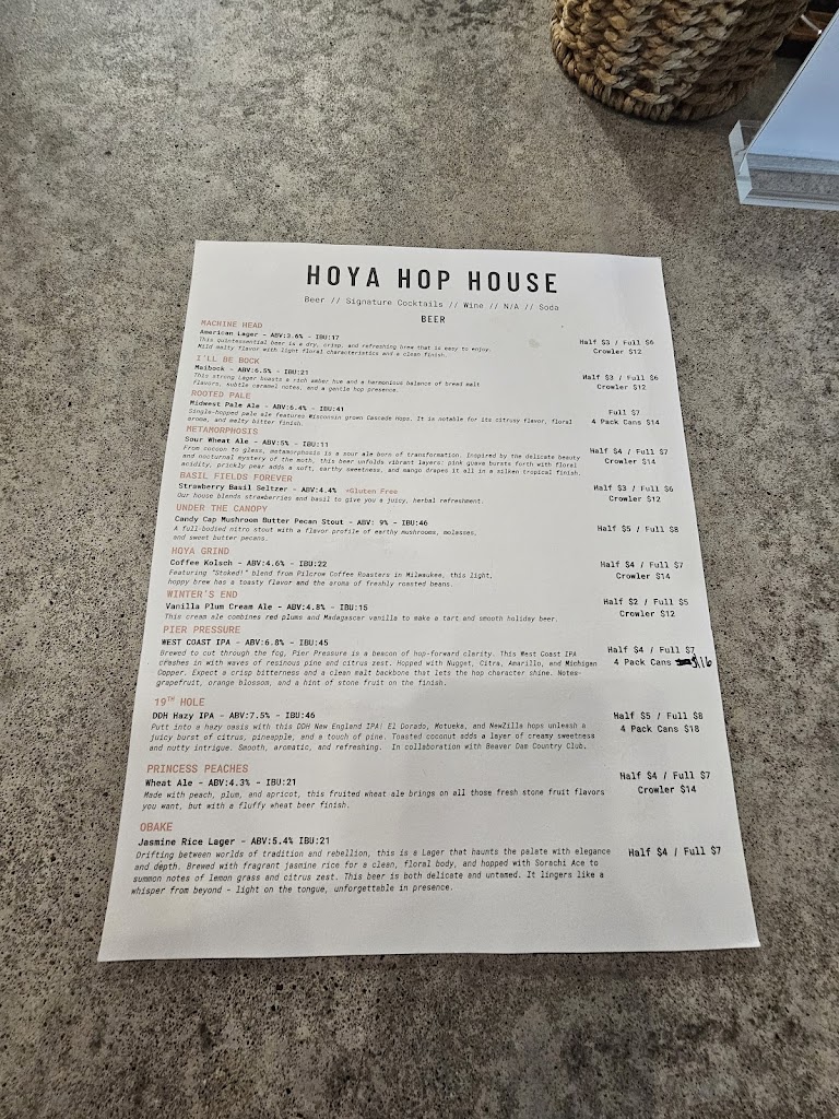 The space has a great vibe. It’s relaxed, clean, and perfect whether you’re hanging out with friends or just enjoying a solo flight. They’ve built something special here, and it shows. You can tell Hoya Hop Brewing is not just about making beer; they’re building a community around it.
