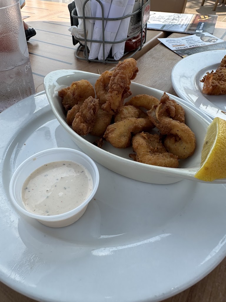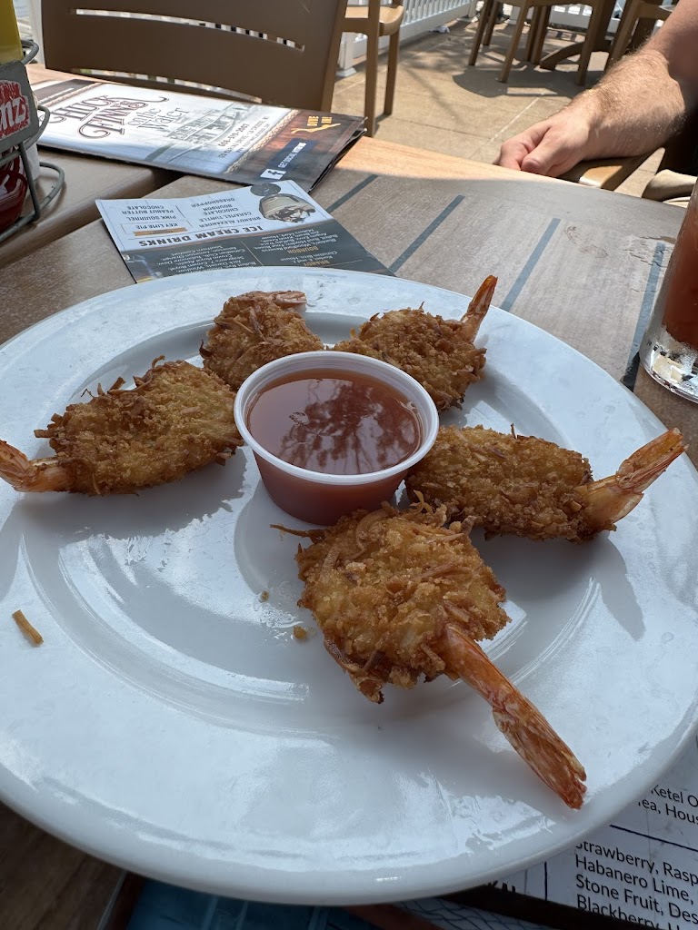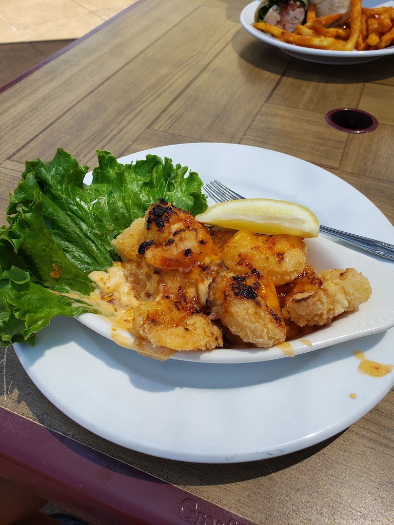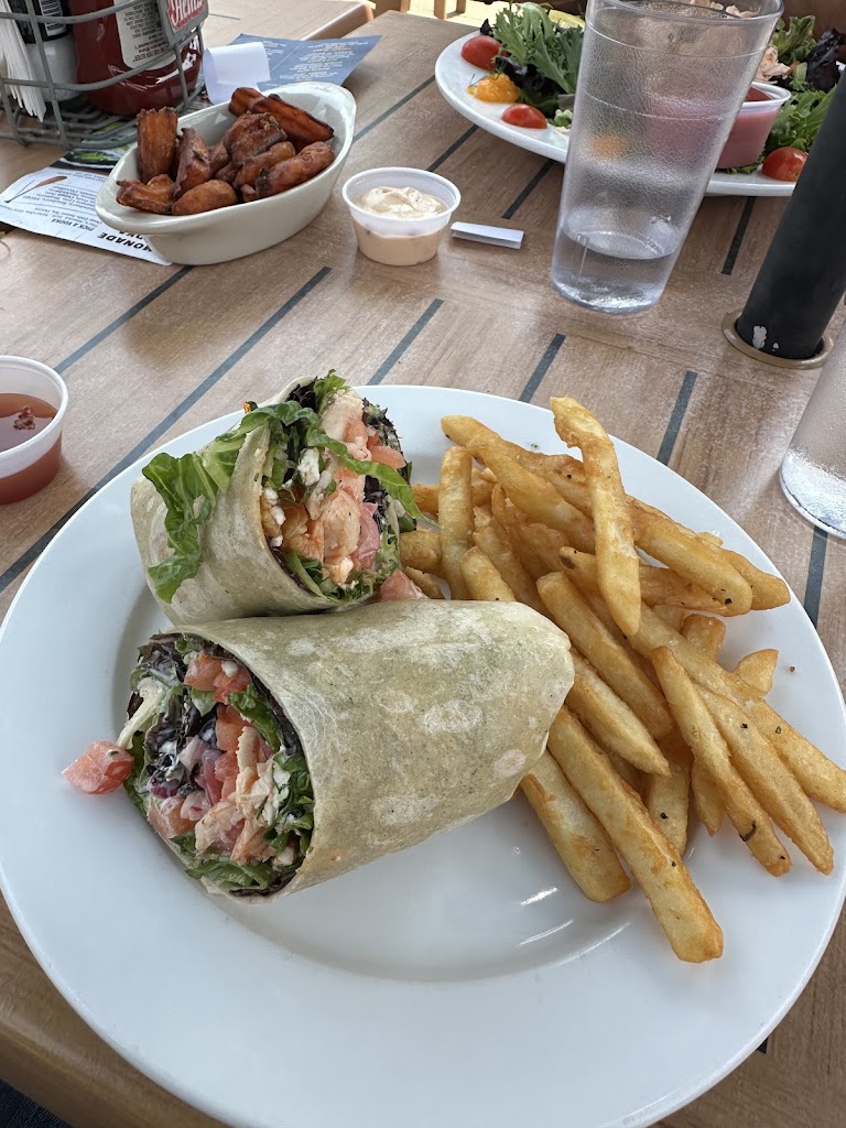 Very cool place at the marina. A little interesting to find but plenty of parking & the food was very good. Our server was very pleasant & he checked back often which was great because it was hot & we went through the drinks. The calamari had a lot of breading on it but was well seasoned & the coconut shrimp was great. The wraps & the salads were also heavy portions & very good.