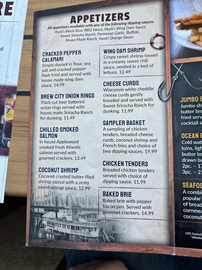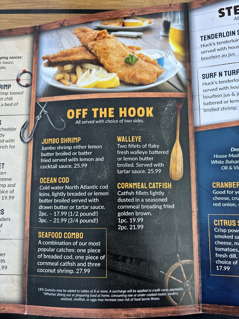 Our son, daughter-in-law and 2 grands were visiting from CT and were hungry for a good wallleye dinnner. We called and reserved an early table, we were seated promptly near the window with a nice view. 3 of us ordered walleye, 1 ordered cod and the kids ordered off the kids menu. The cod was OK, a little tough. All 3 walleyes had a lot of bones, making it difficult to enjoy. Our waitress never came back to the table to refill water glasses. One person ordered ice tea and we were surprised when the bill came that we were charged for a refill on the tea. Most places offer free refills. We mentioned the issue with the bones in the walleye to our waitress when she brought the bill and her response was a snarky βwell it IS fishβ. We just wanted to let them know that maybe they should change or check on the supplier. We have ordered walleye at other establishments and have never had problems with bones. (Our favorite fish place was closed on this day or we would have gone there.). Needless to say, we have no plans of going to Huck Finnβs ever again.