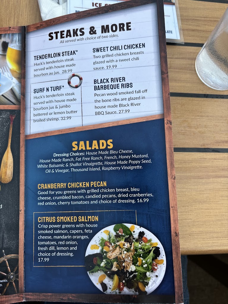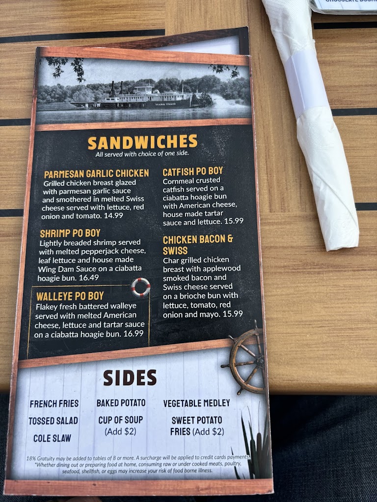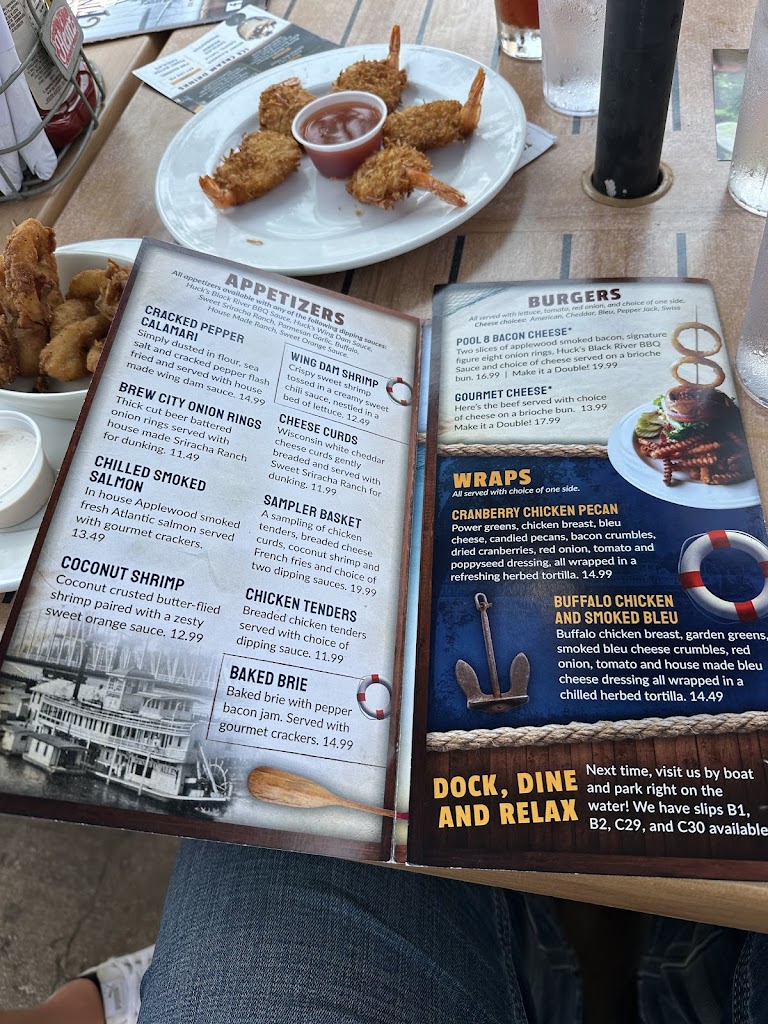 The food was good, my brother from out of town and I had the Walleye po boy, with coleslaw which was great! The drinks were good, and the bartender addressed us right away. Our waitress gave us our food, then ended up leaving. That was the only downside, had to get up from our table for assistance. Otherwise Huck Finn's has always been enjoyable, and attentive, and friendly. Beautiful atmosphere right on the river! Beautiful Summer day!