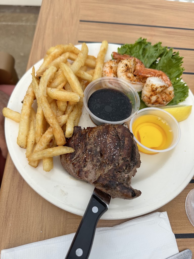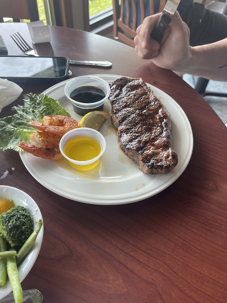 I ordered the surf and turf with a baked potato and tossed salad as my sides. Food comes out the potato is literally the size of 2 golf balls combined, the salad is a triple handful of greens, half a grape tomato, 3 slices of cucumber, and 6 croutons. The shrimp batter was great, but the shrimp were the size of maybe my index finger. The steak was ordered medium well, the edges were well done, which I expected, the center was medium (cool center). Which was a surprise because the steak was literally a 3 maybe 4 ounce circle with the same thickness throughout. The steak was definitely not a steakhouse steak, it had no seasoning at all, and was reflected even in the au jus that was just as bland.