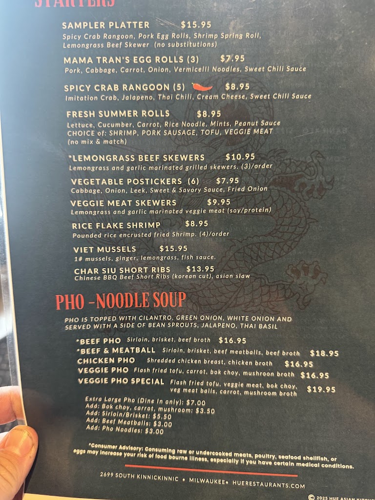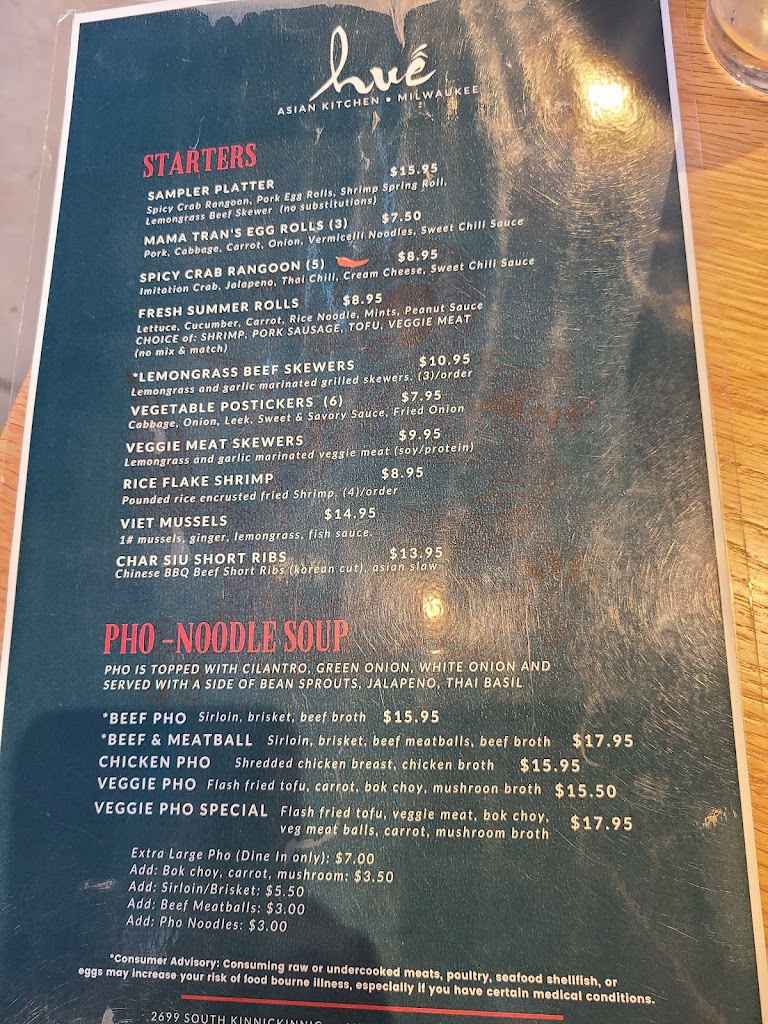 I LOVE Hue Asian Kitchen! Their Pho is delicious, in fact everything I've ordered has been awesome. When an out-of-town guest visits, we highly recommend that they make this a stop on their cuisine tour of Milwaukee. Thank you, Hue!