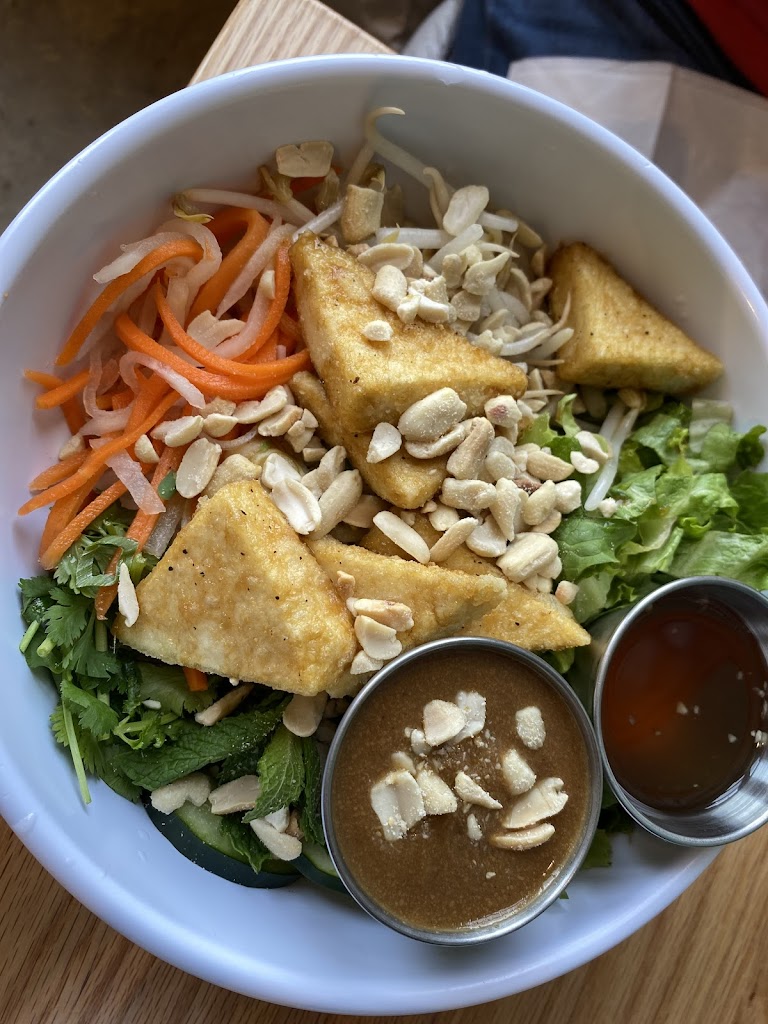 This is one of the few places where I can go and know I will not get sick-dairy allergy here! I love the fresh spring rolls-very tender and fresh and you can ask for things to be left out -like I don't tolerate lettuce. I have had the Friday fish fry before- perfect flake, texture and taste-slightly oily but it is a fish fry. I love the Banh mi sandwich-the veggie meat tends to be on the saltier side-but they listen when you don't want onions on the sandwich-or extra veggies. The prices are a bit high, however location might be part of it, and the ingredients are always fresh. The service is hit or miss, and sometimes slow but always friendly. I have had the fried rice-7 out of 10, the Veggie Pho 6 out of 10, I do not recommend the Chicken Curry-very little sauce and not very tasty. It would be nice if the owner took some time to thank his reviewers for their kind words and their continued business.
