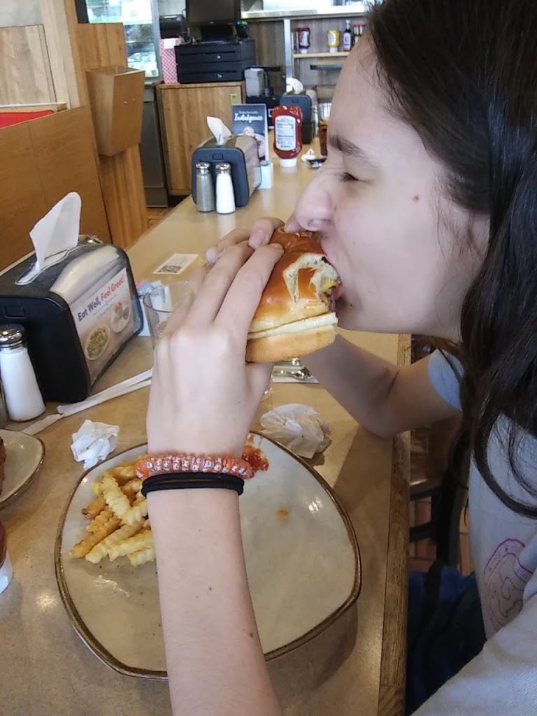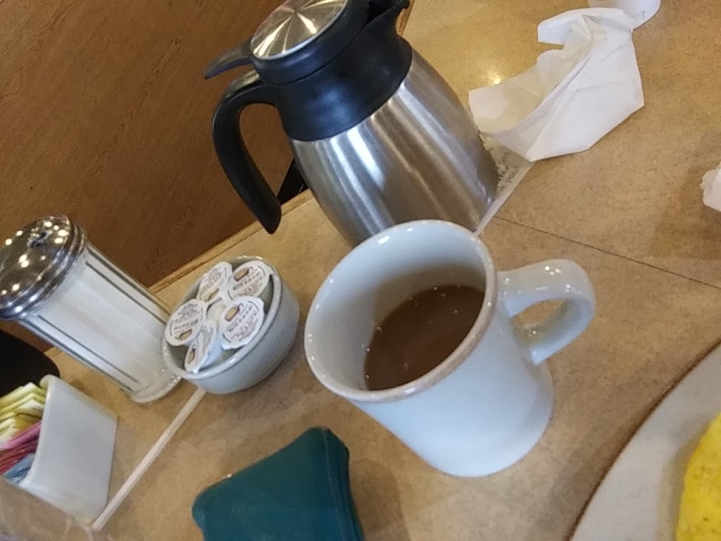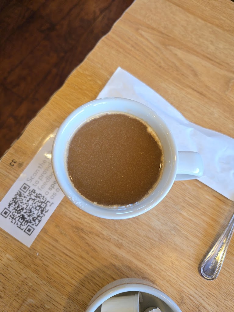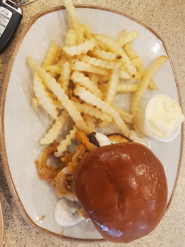 Steak burger and fries along with a few cups of coffee. Excellent💯