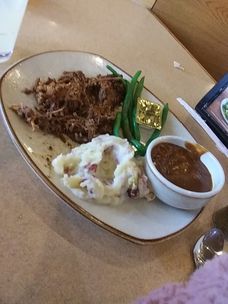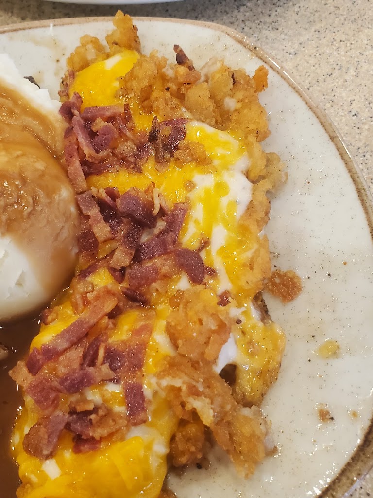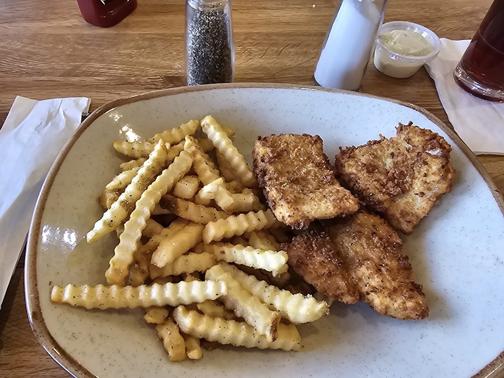 Fish cooked nicely, grilled tilapia , french green beans sweet and tender, big baked potato. Big plate, reasonable prices.
