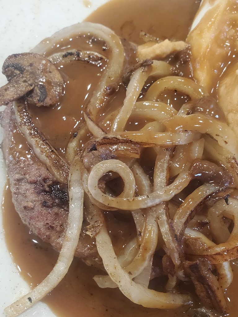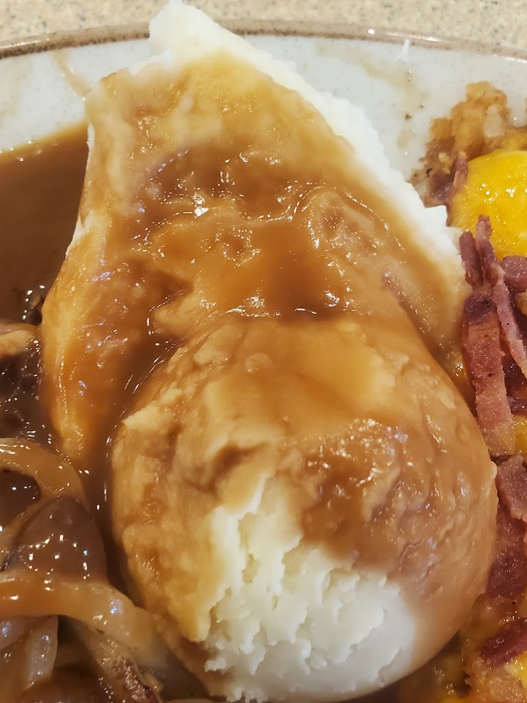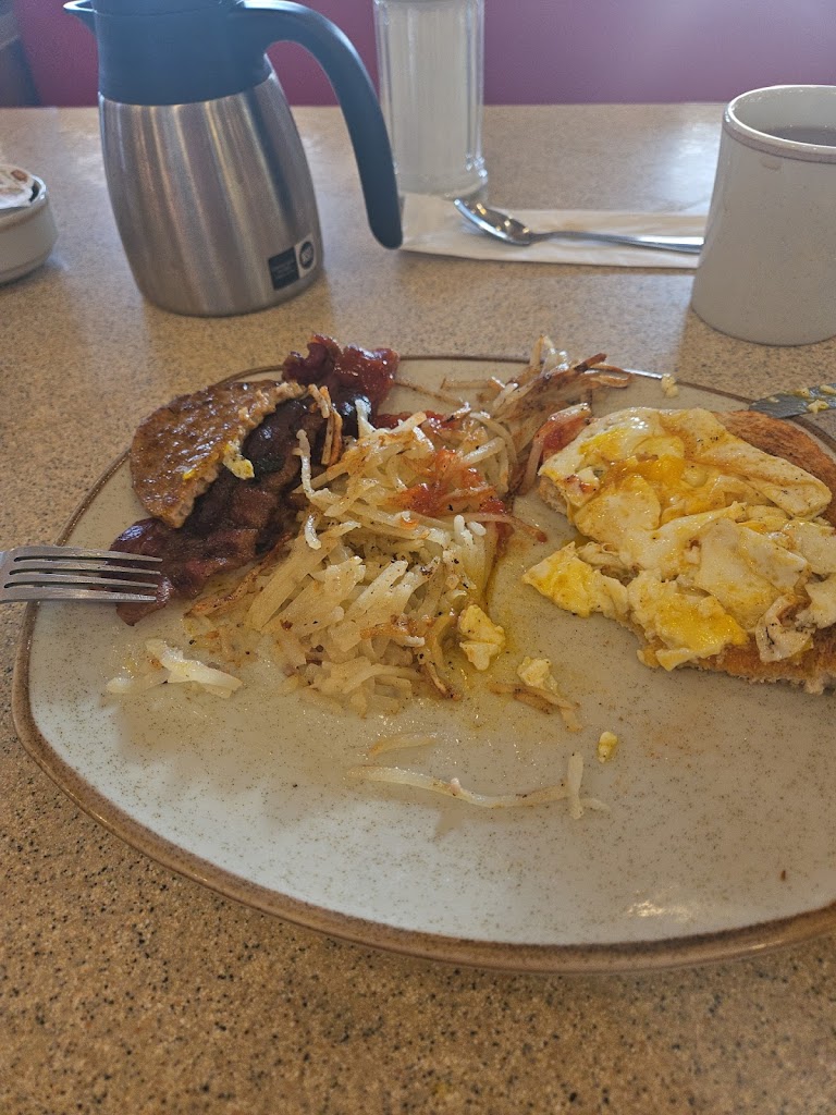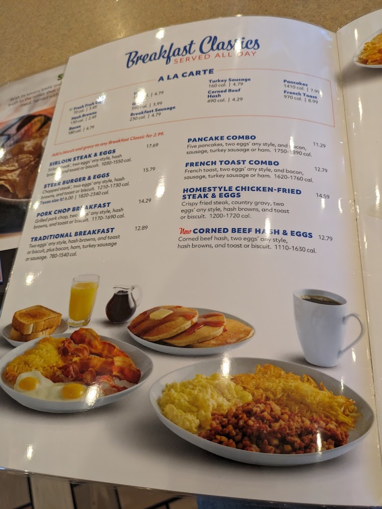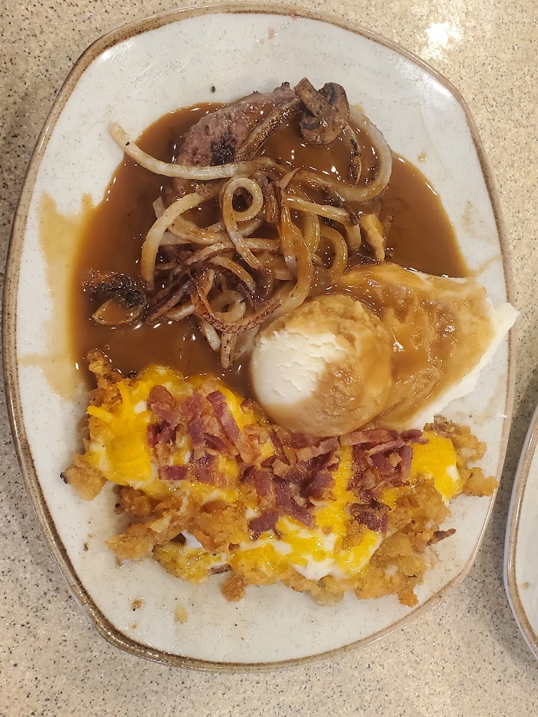 I had steak, eggs, hash browns with onion&real cheddar on top.. Food was hot and cooked to order. Delicious, fairly thick (1"?), tender, steak, that was not marbled with fat or riddled with gristle. Hash browns were crispy and the onions perfect inside.I opted out of getting the pancakes or toast that came with the meal.