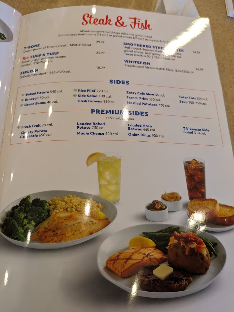 The steak was surprisingly fantastic. Chef was able to hit a perfect rare and the flavor was good. Tots were crispy, overall was a good meal. Definitely the best steak I've had from a large chain truck stop though.