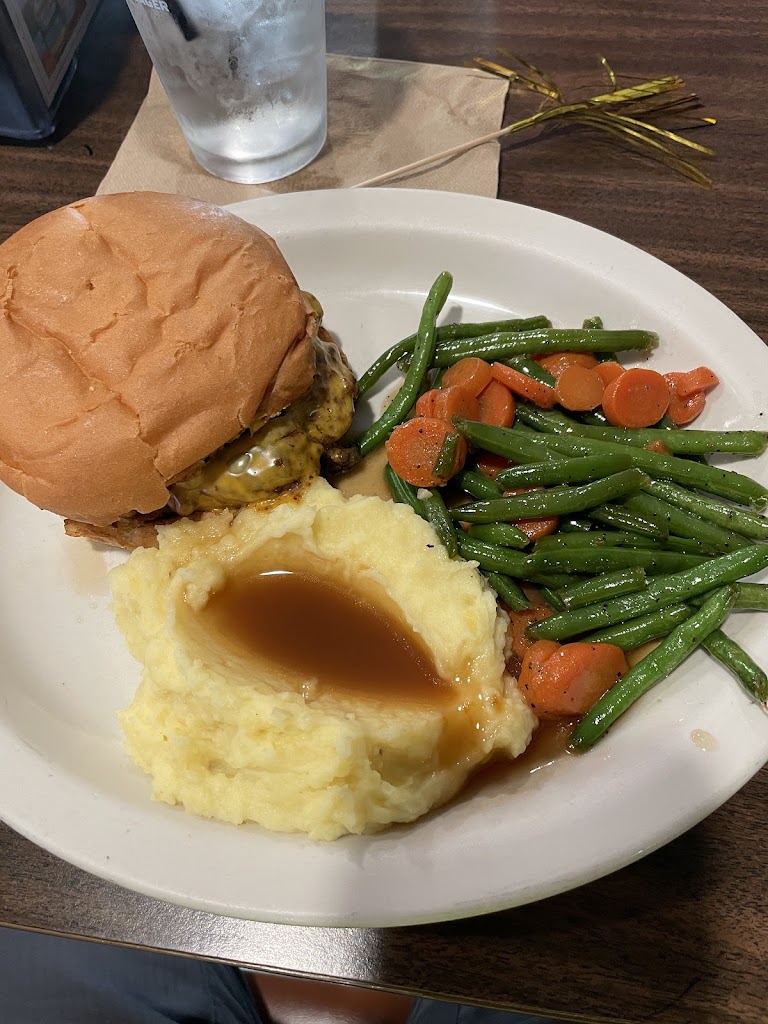 I love these small town places. Out for a ride and checking the route and found this place. Pulled in Open sign was on so we went in. Grabbed a round of beers and menus. Went with a basic cheeseburger and then asked for Mashed potatoes and gravy since that was part of the special for the night along with a side of the vegetables. Not sure but the burger had to be 1/2 pound hand made. I like thick burgers and this had some great seasoning and was juicy while cooked medium well. Would definitely go back.