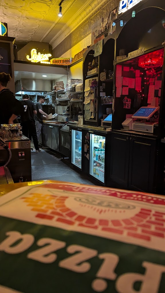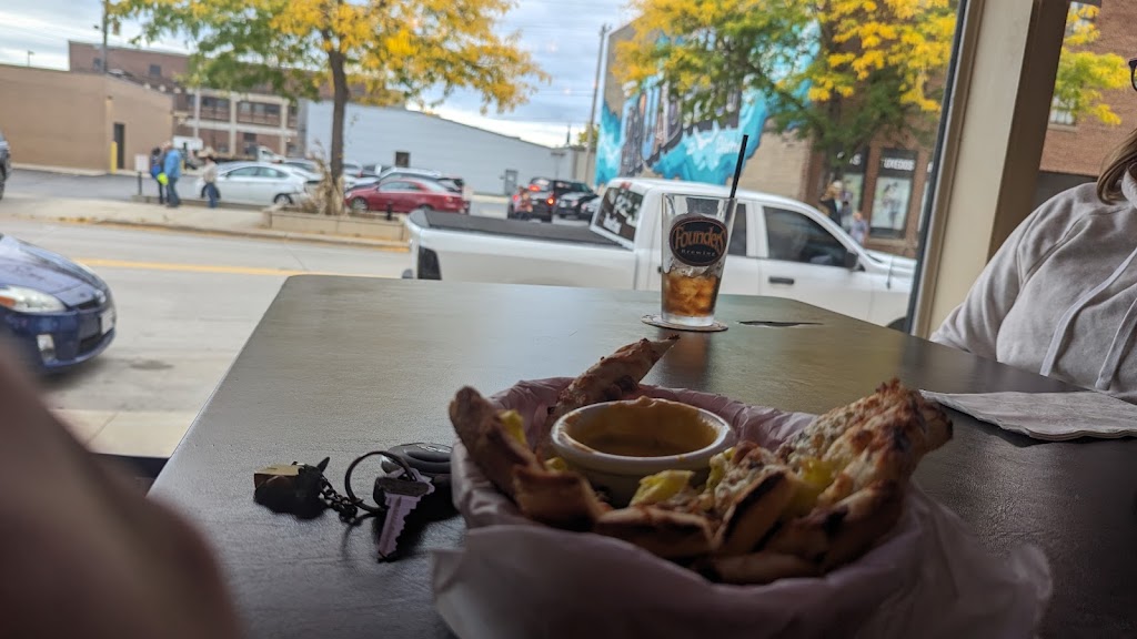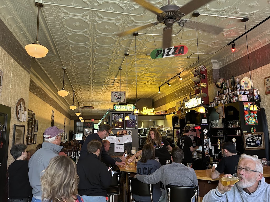 Pizza is my favorite food. This is an interesting example of a cross between a deep dish and a traditional pizza - it's a long bake like a deep dish, but not nearly as thick in the middle. I found the crust tasty and the toppings were piled on thick. The large comes cut into a bunch of little rectangular pieces, could feed 3-4 people. Some local / WI beer options, and our waitress was nice and always available for a refill. The one thing that surprised me was the lack of additional items for appetizers other than bread sticks, especially given the wait time on the pizza. It's located on Broadway in an old building in an area that's working hard to revitalize. The inside is a funky mix of interior decorating and there's only a few high tops in the front area and then small booths running along the side.
