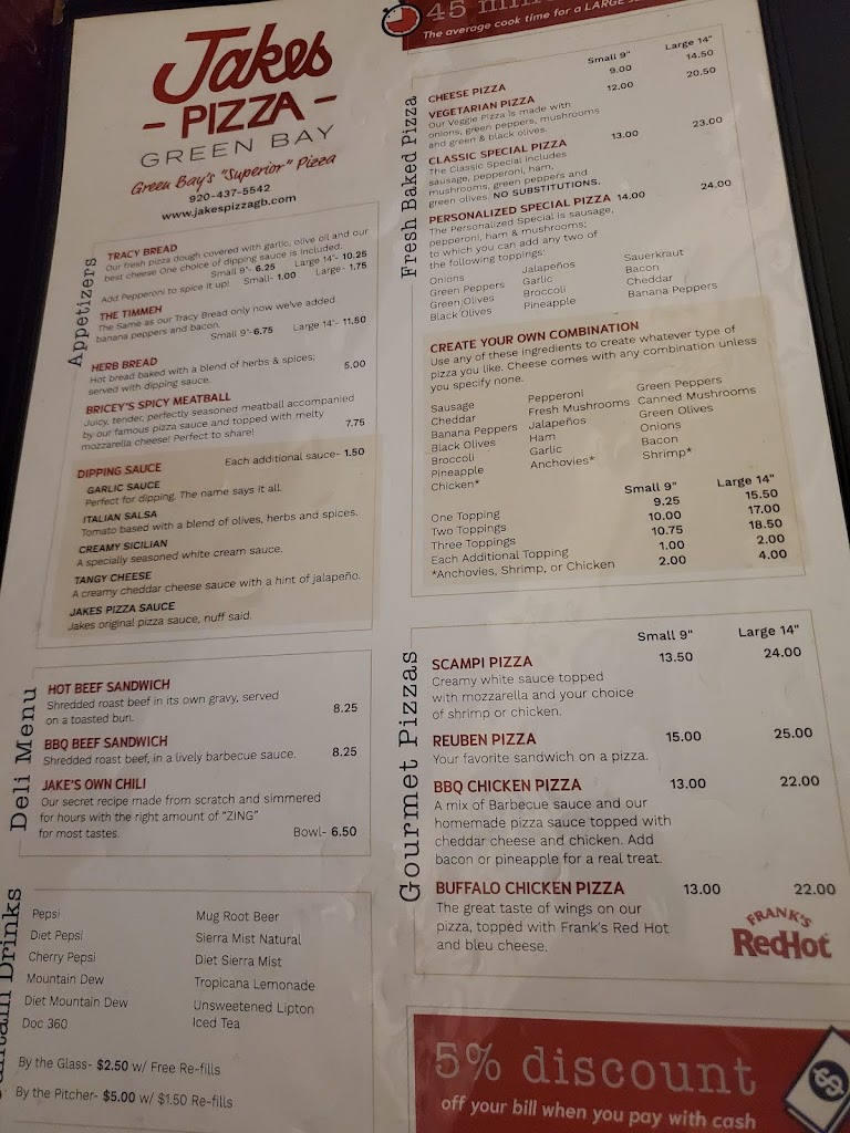 Jake’s Pizza in Green Bay is a hidden gem with amazing staff who make you feel right at home. Their artisan pizzas are top-notch—packed with flavor and clearly made with care. Just a tip: if you're in a hurry, go with a small pizza. The large ones are worth the wait but can take up to an hour to prepare.