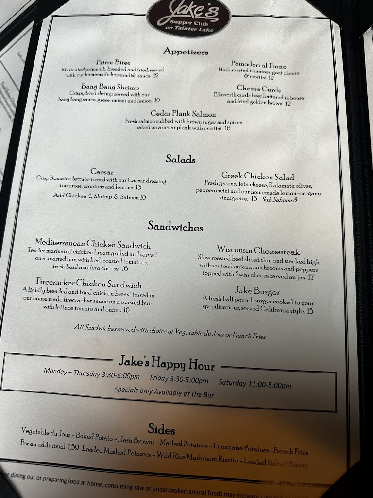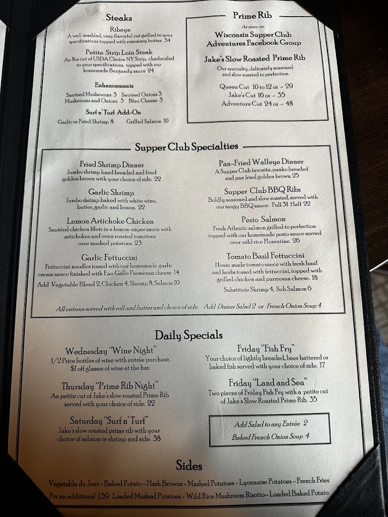 We have been going to Jake’s for 40 years! It’s such a nice date night! We enjoyed the music on the deck and had the best pan fried walleye and prime rib!