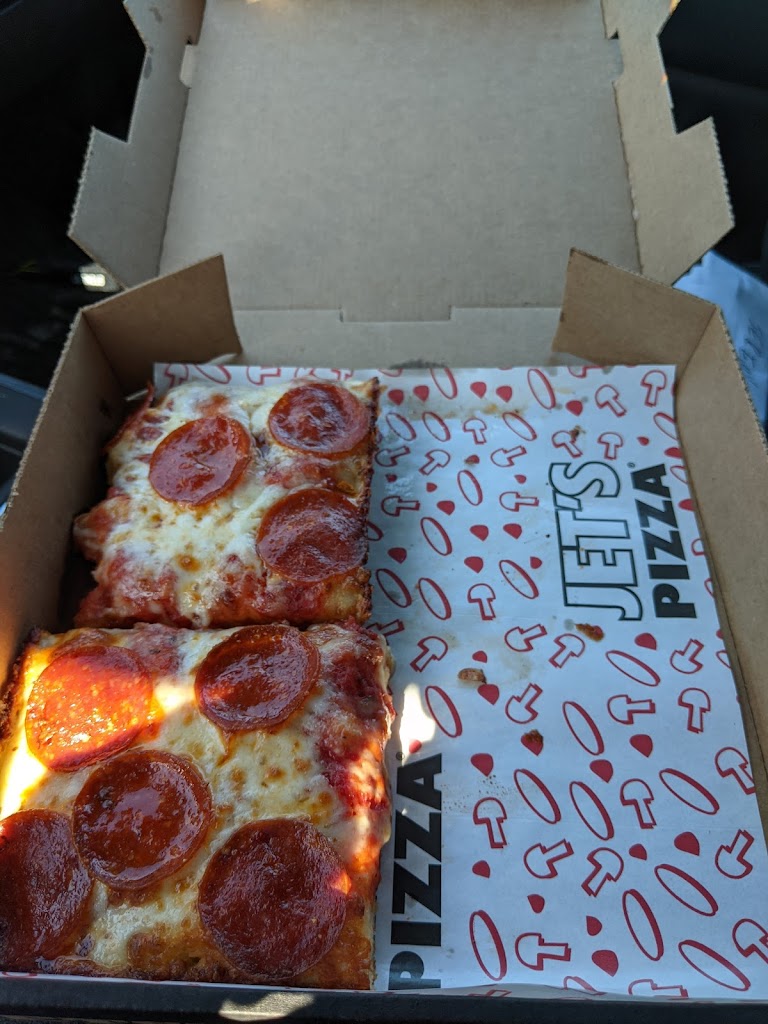 Good Detroit style pizza, but a little greasy. The Jet bread is chewy and cheesy. Mainly a take out and delivery place.
