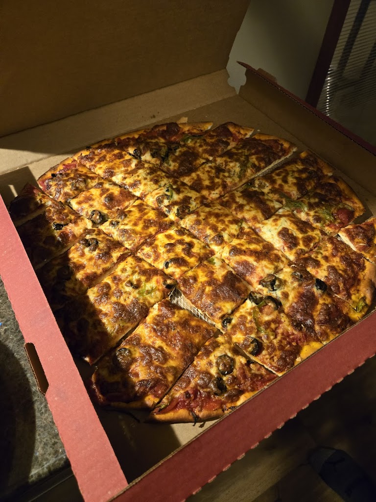 Was greeted with friendly service with a smile. The order was ready on time. The thin crust was crispy throughout the whole pie, and it was cooked perfectly. I will be back! Definitely want to try the thick crust next.