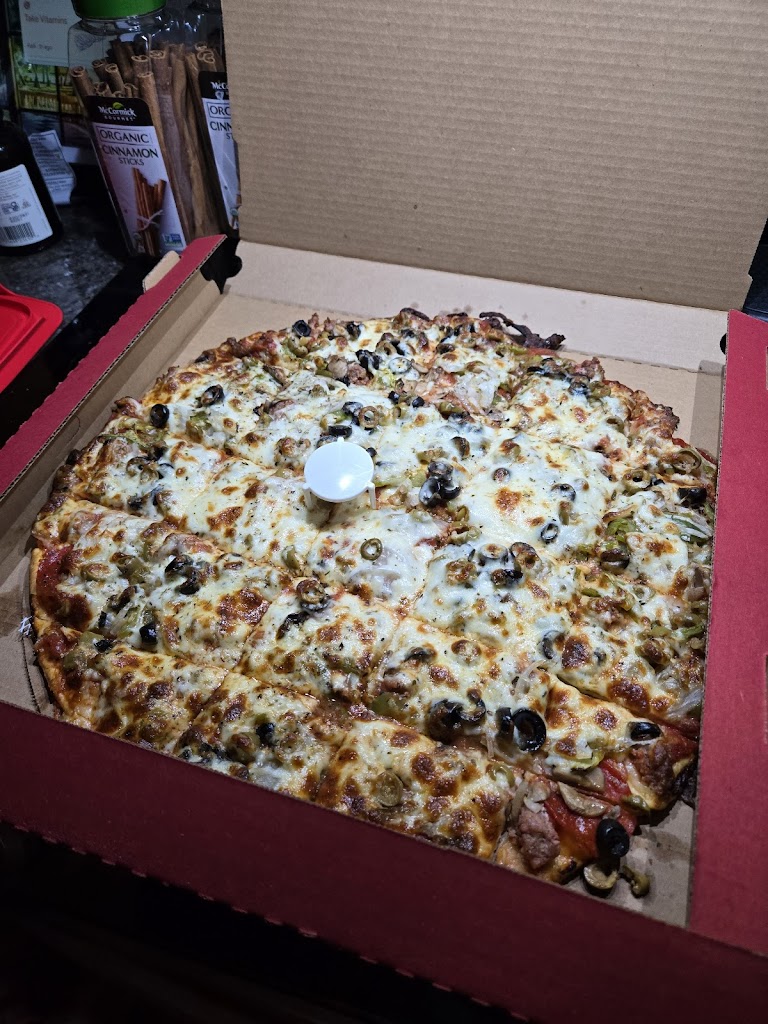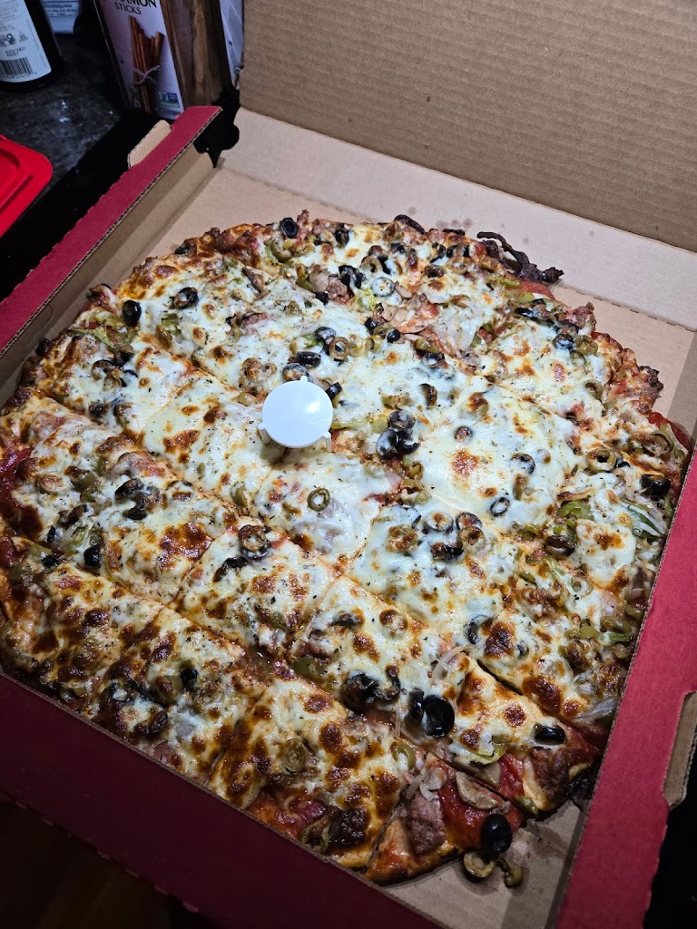 Had pizza Saturday night. First time. Take out. We enjoyed this pizza alot. Fresh toppings. Sauce is spot on. Will be coming back for more!!
