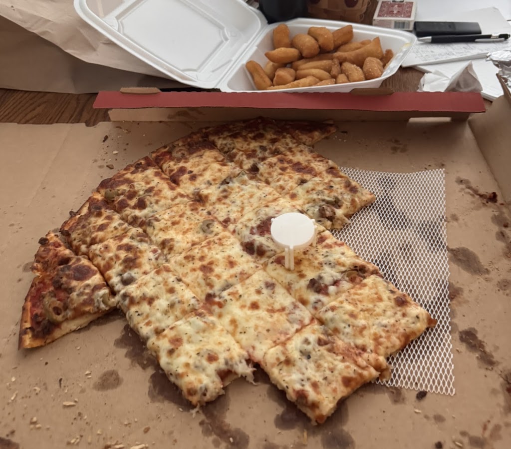 We ordered a thin crust pizza with BBQ sauce and grilled chicken and a cheese sausage with black olives. The crust was good, not even quite sure if it was grilled chicken we had. I was expecting pieces of chicken, not ground meat. There was a very small amount of olives on the second pizza. We also had bread sticks and mozzarella sticks. Those were okay. Paid extra for a cup of ranch I never got. Don’t think we will be ordering from here again. Expensive for not so good food.