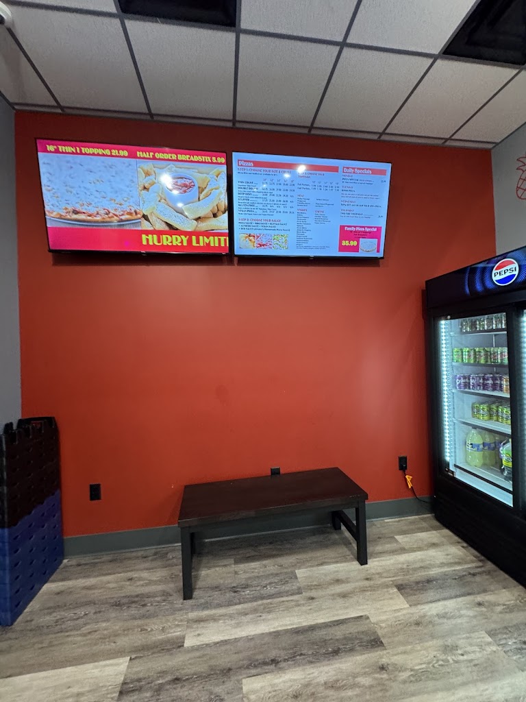 No frills waiting and dining area but I believe the intent is not to expect a lot of dine in customers anyway. Ordered a 14" thin crust at the counter last night along with some bread sticks. Order was ready in 15 minutes. Very convenient. Excellent balance of toppings. Pizza flavor is so subjective. This one pleased me. Very good. Welcome to the neighborhood.