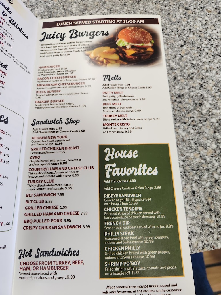 We stopped while traveling through for lunch. We had a bacon cheeseburger and grilled ham and cheese club sandwich.