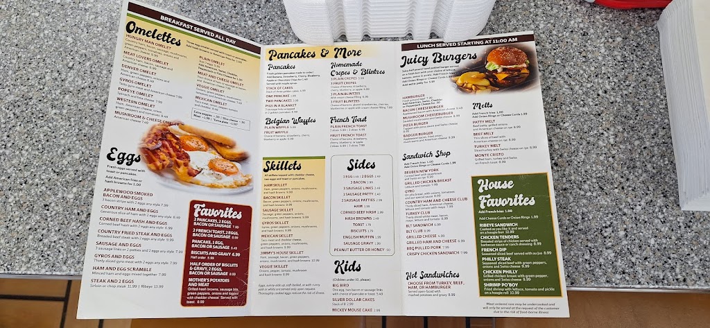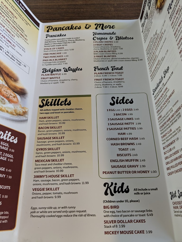 Typical diner fare done well, friendly and attentive staff, and more than fair prices. What’s not to like? Reviewers on sites like Google, Yelp, or Trip Advisor are too full of themselves to just give a simple and concise review. We are not professionals. Judge a local place for what it is, not what you want it to be. Thank you, Jimmy’s for your hospitality.