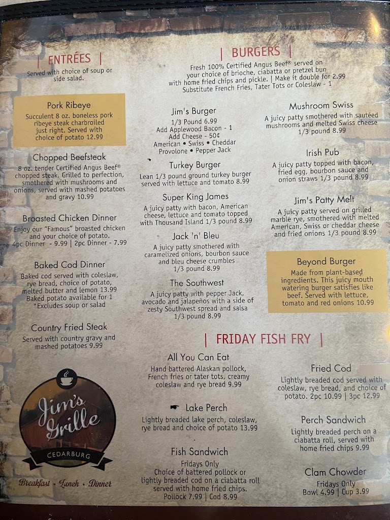 Welcome to Jims Grille, your friendly local eatery in Cedarburg, WI, where a delicious and satisfying meal awaits you any day of the week! Our warm and welcoming atmosphere, paired with fresh coffee and hearty smiles, promises a delightful experience. Enjoy breakfast at any time, savor our handmade sandwiches and pizzas crafted to order, or indulge in our renowned broasted chicken available in various sizes. Whether dining in or carrying out, Jims Grille is ready to serve you!