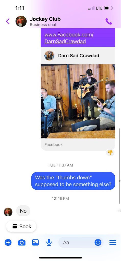 Whoever books their music is VERY UNPROFESSIONAL! They posted on a page that they were booking bands for Summer. I sent them a message with our information and rather than respond, they reacted to my message with 😠 then changed it to👎 needless to say, they will NEVER get my business!! If you click on the picture below, you can see the message, so it DID happen! If you didn’t do it, one of your employees did!! Lying only makes it worse!