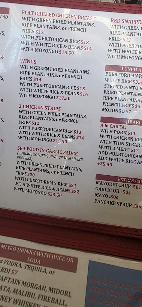 La comida tiene un sabor original de Puerto Rico, lo malo fue los precios que no coincidian con la carta, la pagina y el cobro en el recibo, pedi unas wings con mofongo y me cobraron 3 dolares de diferencia, al preguntar solo me dijeron, incrementamos los precios, pero en ningun lugar estaba especificado.