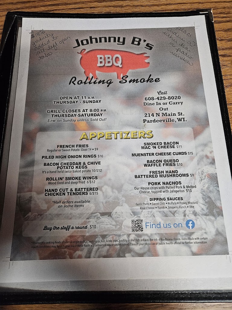 Welcome to Johnny B’s Rolling Smoke, a top-tier bar and grill proudly serving Pardeeville, WI, since 2015. Indulge in our specialty wood-fired barbecue and homemade sauces crafted from scratch with passion and precision. Enjoy the vibrant atmosphere with both indoor and outdoor dining, live music, a full bar, and catering services to make any occasion unforgettable. Honored as the best BBQ in northwestern Wisconsin, we are excited to partner with the communities of Portage, Wisconsin Dells, and Rio. Visit us today for a premier bar and grill experience and savor the mouthwatering flavors of our exceptional barbecue!