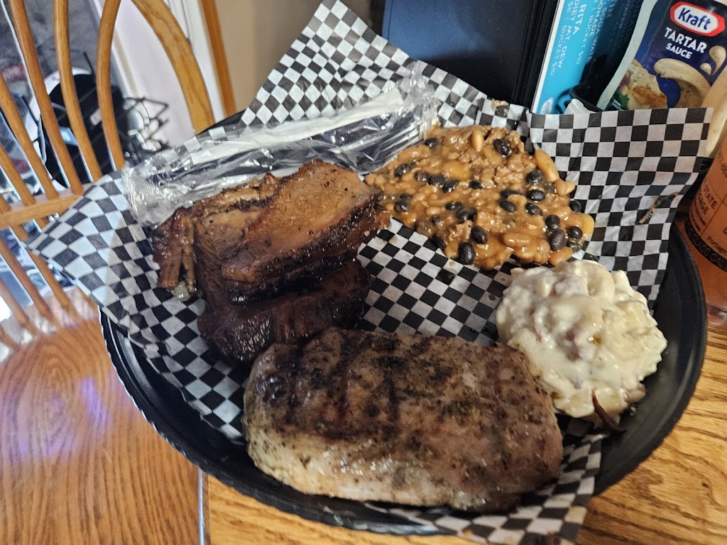 Delicious rack of ribs and pulled pork! Cowboys beans were also good. Chairs for the table inside were way too short for the table. Staff were very friendly.