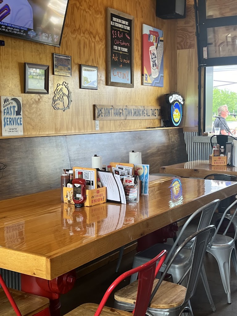 Great patio dining with a smaller indoor area with great atmosphere. Food is delicious! Loved the brisket and bacon mac n cheese. It took a while to come out, which is fair because they had a sign posted indicating it would take 20-30 minutes. It took a while to get our order taken and our drinks refilled. That aspect could be more efficient to help the very busy staff. Lastly, no hairnets and I found two hairs in my food.