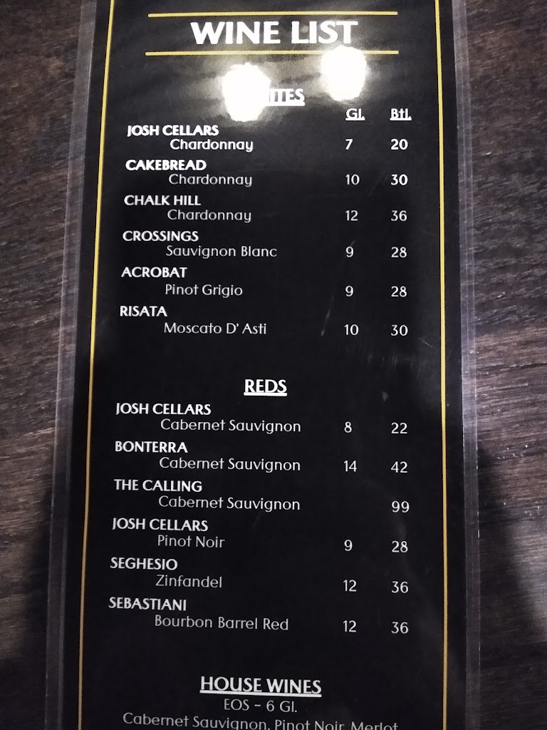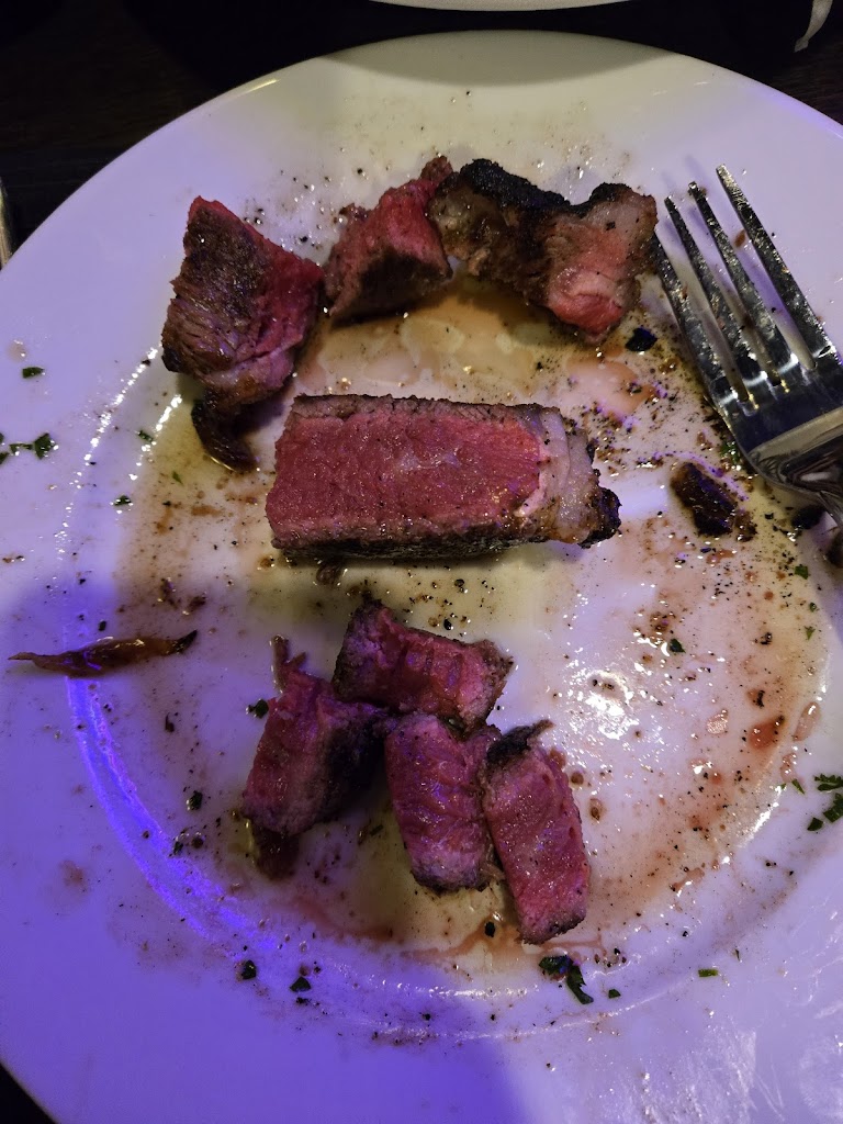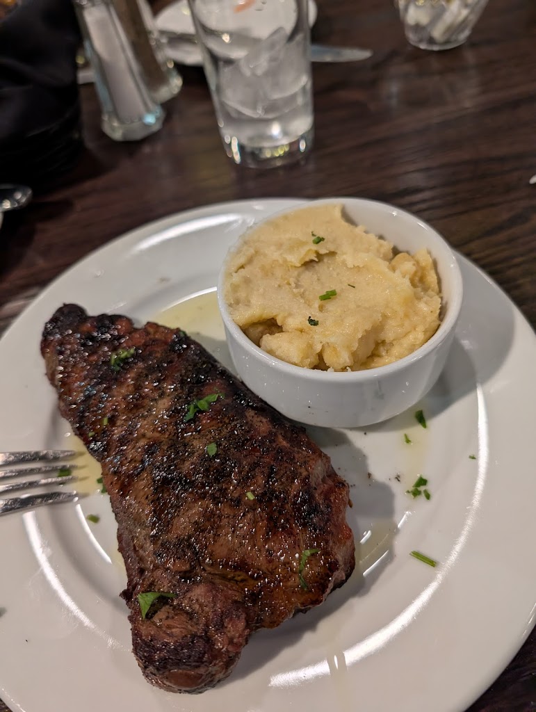 The good: we were seated right away, and the restaurant is clean and tidy. Drinks (a chocolate martini and a Whiskey Daisey) were GREAT. My Ribeye was cooked as requested, and the portion very generous. It had a nice flavor with the herb butter a nice addition. The bar is a bright spot with a great variety of cocktails, ours were well made. The wine list is sparse but has some GREAT selections that pair well with the menu, including Josh Cellars Pinot Noir which is one of my current favorites to pair with steak. The bar sent a generous pour of that Pinot. Our server was fast and we didn't wait long for our meal.