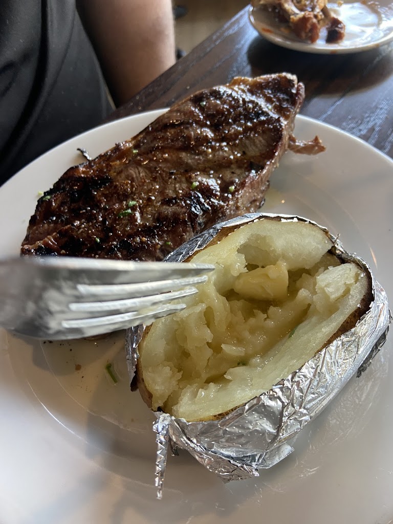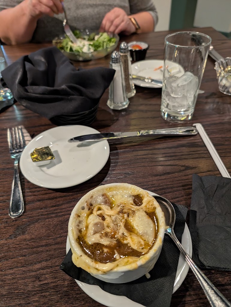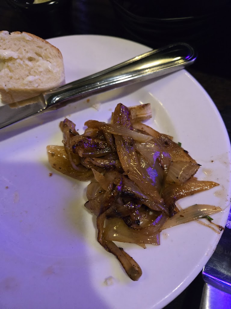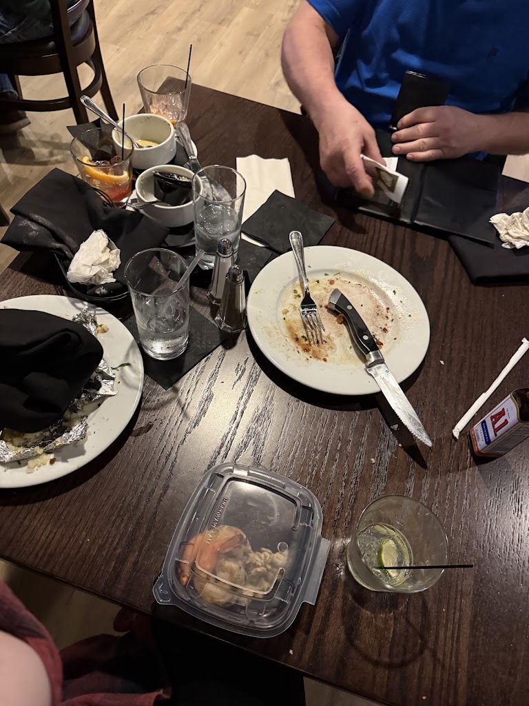 There’s another review here say it’s “mediocre at best” and I couldn’t agree more. I’ll start with my meal. The best thing on my plate tonight was the loaded baked potato side that I had with a 6oz filet and shrimp. I got four large shrimp, two were damn near raw, one tastes like it had gone bad and the last one was fine. The steak was finished at the perfect temperature however, it tasted bitter, as if it was cooked on a dirty grill. The service was terrible as well. She did not introduce herself when she got to our table and seemed very socially awkward (not the best as a waitress imo). No one cleared our table as we finished drinks, bread and soup (see photo). At the end our waitress admitted to forgetting about us as she “tends to start many tasks”.