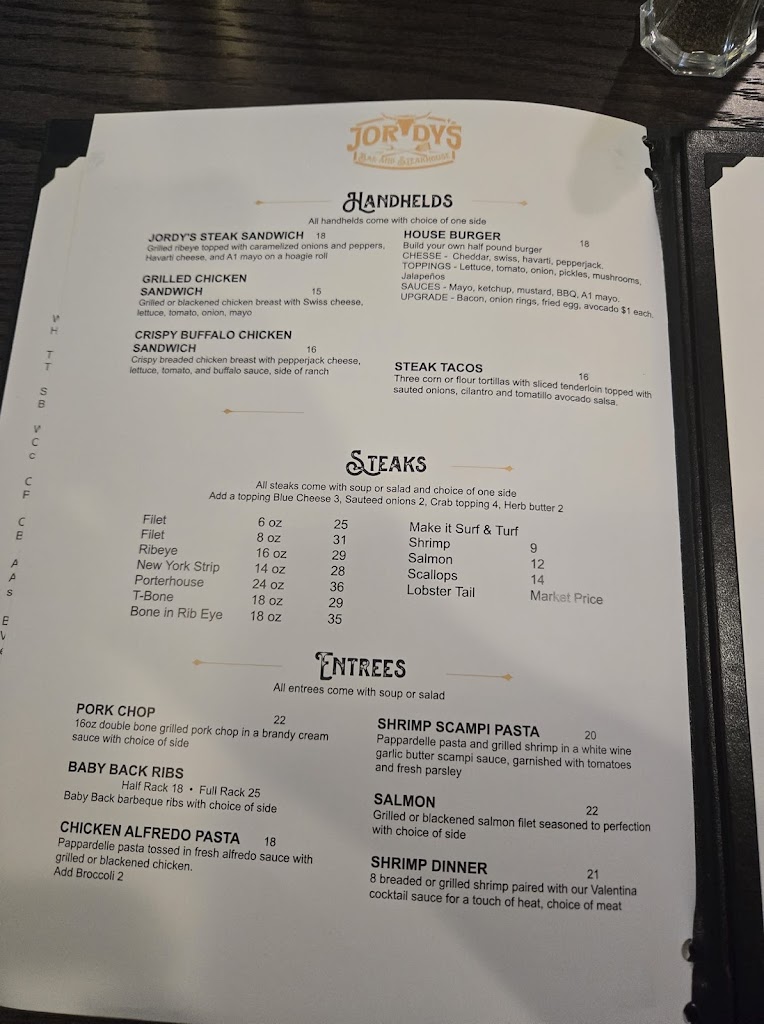 First time here and so glad we came in. Awesome food and staff. Had the double bone pork chop and it was awesome!! French onion soup was very very good, fresh hot bread great wings. A must try if in the area.. great job Jordy’s!!!
